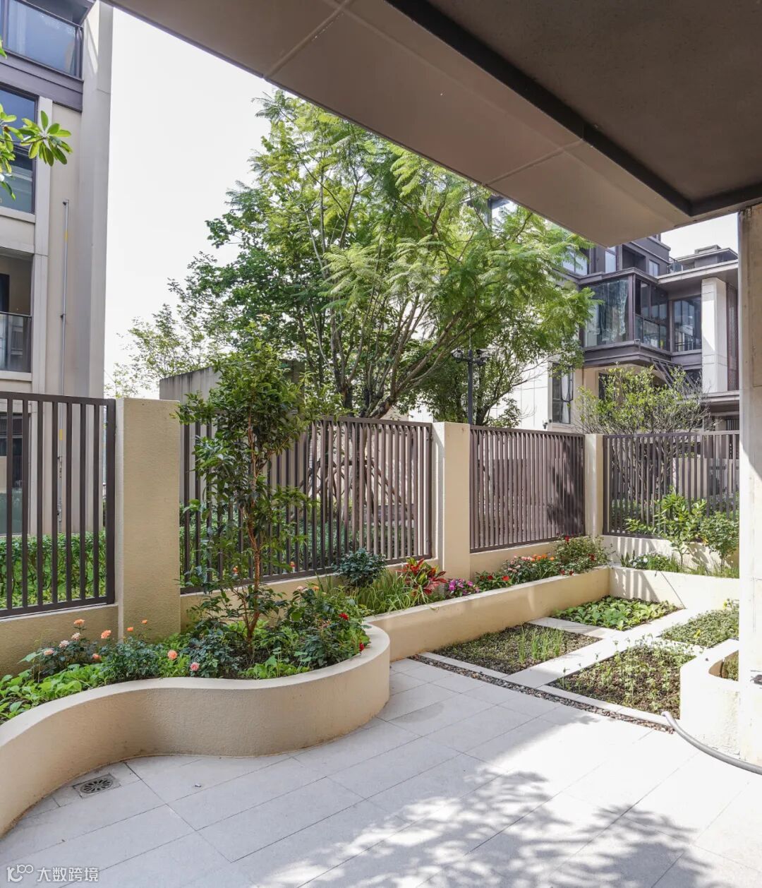 全景推拉门,庭院绿植与室内无缝衔接,庭院铺大理石地板,搭配水景墙与错落绿植,午后一杯咖啡、一本好书,惬意值爆表!