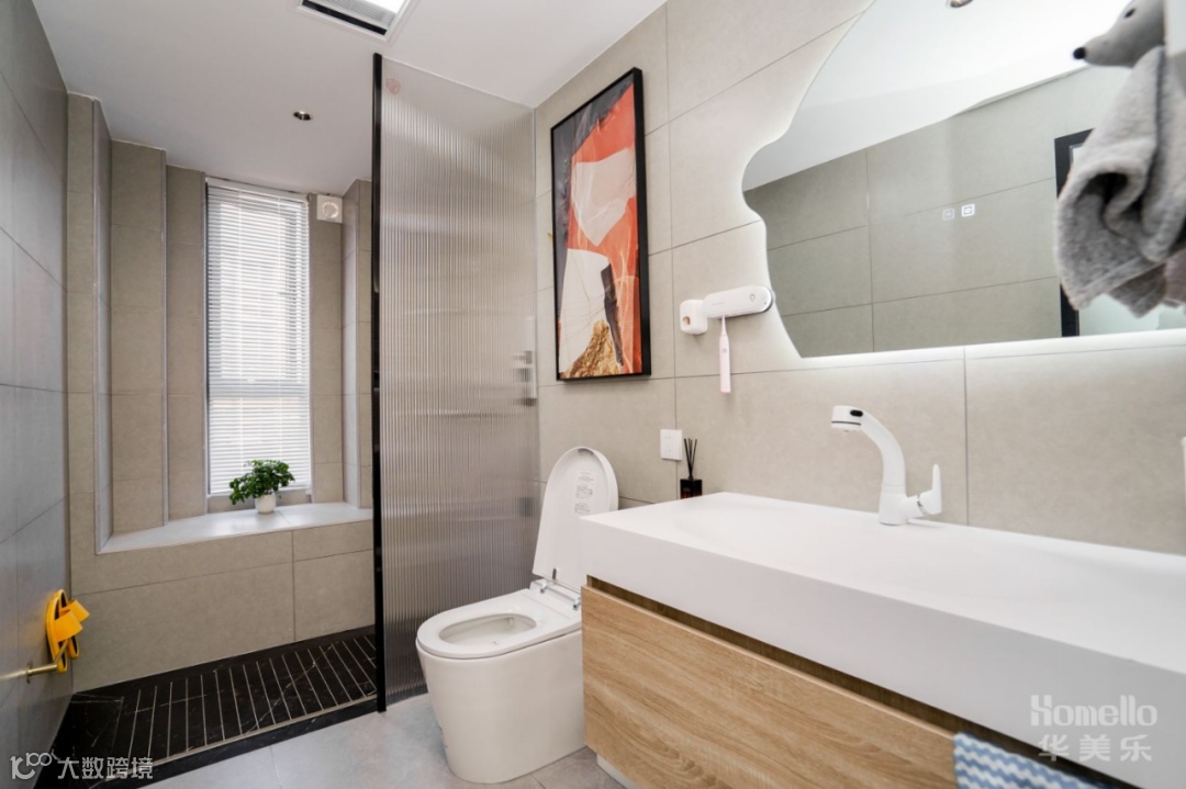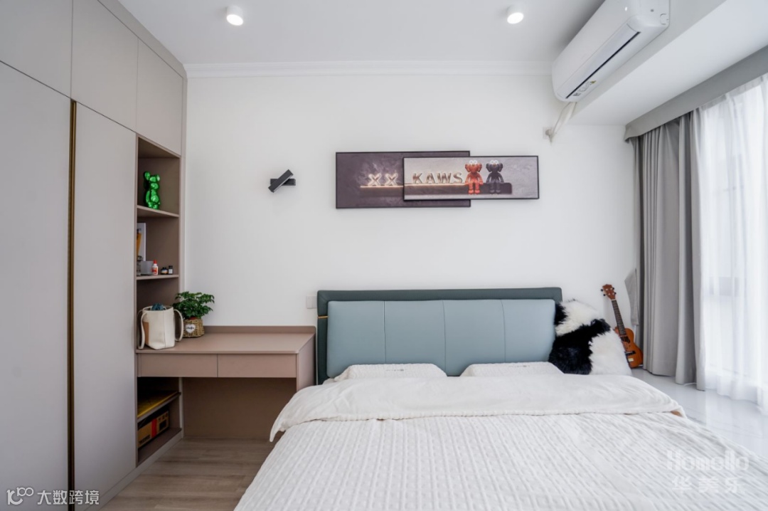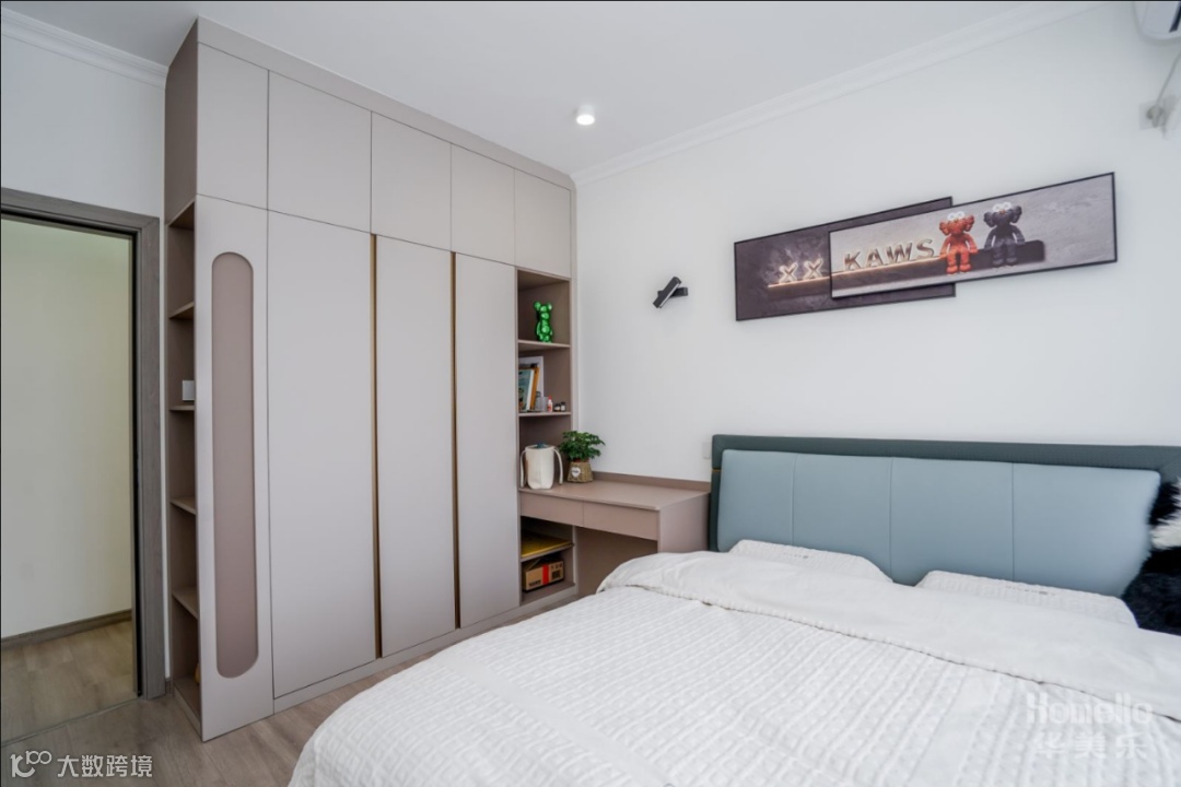 次卧衣柜与书桌定制一体,书桌往柜体内部延伸的方向开放式的书柜,与桌面0距离,方便拿取。另外,将更衣和学习两者动线融合在了一起,行为切换上方便,另外不会妨碍到任意一者使用的空间。
