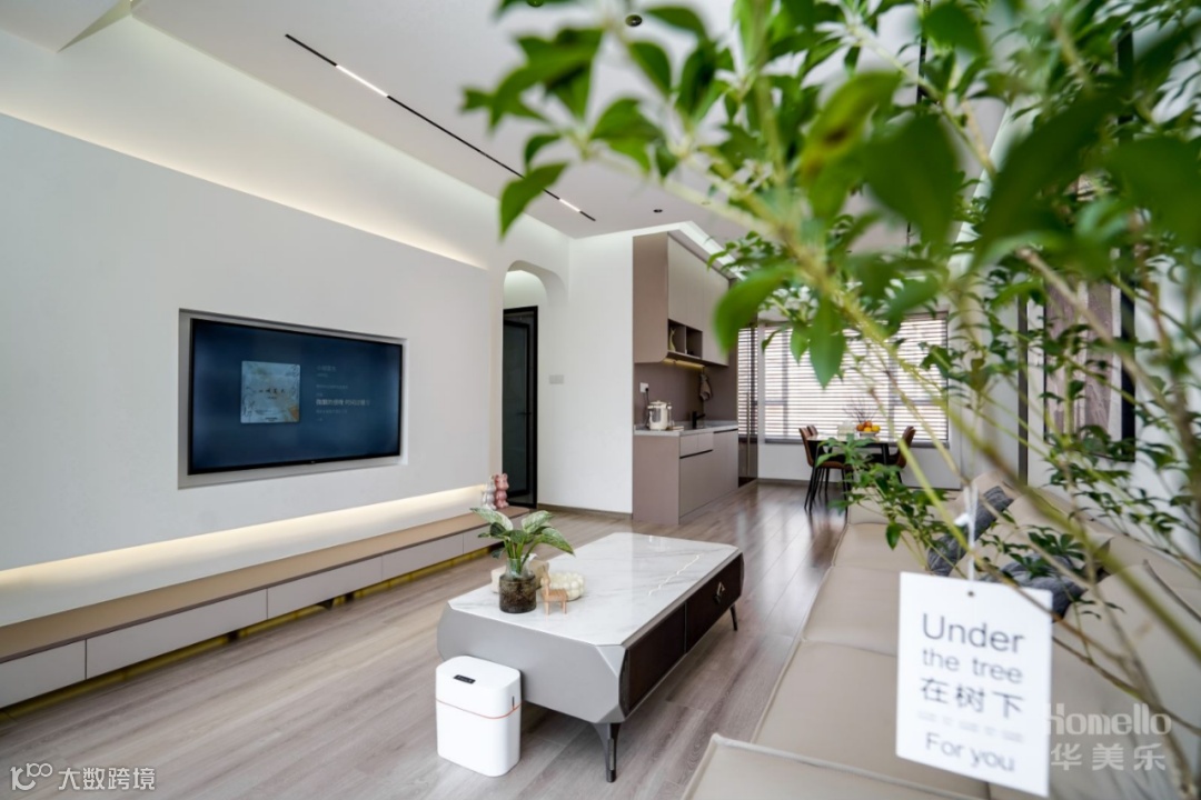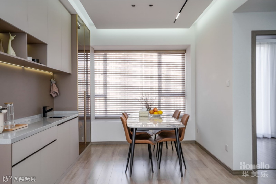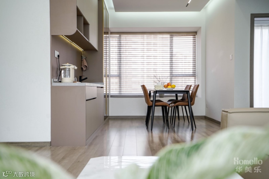 从客厅看向餐厅,给予视觉上开阔明亮的观感。客餐厅连通一体,公共空间无界限,让动线及视野都更为流畅与舒适。由收纳柜、饮水区和玻璃柜组成餐边柜,功能性更强。玻璃柜放置贵重的藏品,因此加装了内置灯,能让藏品以更好的姿态呈现,从而提升整个就餐环境的颜值与档次。