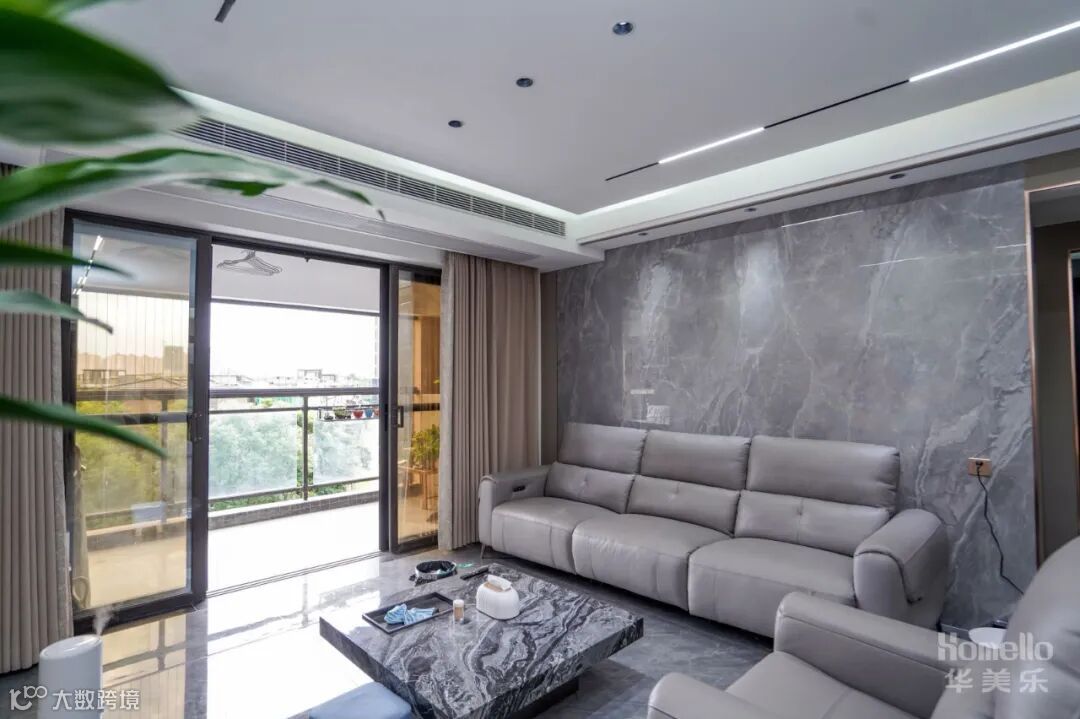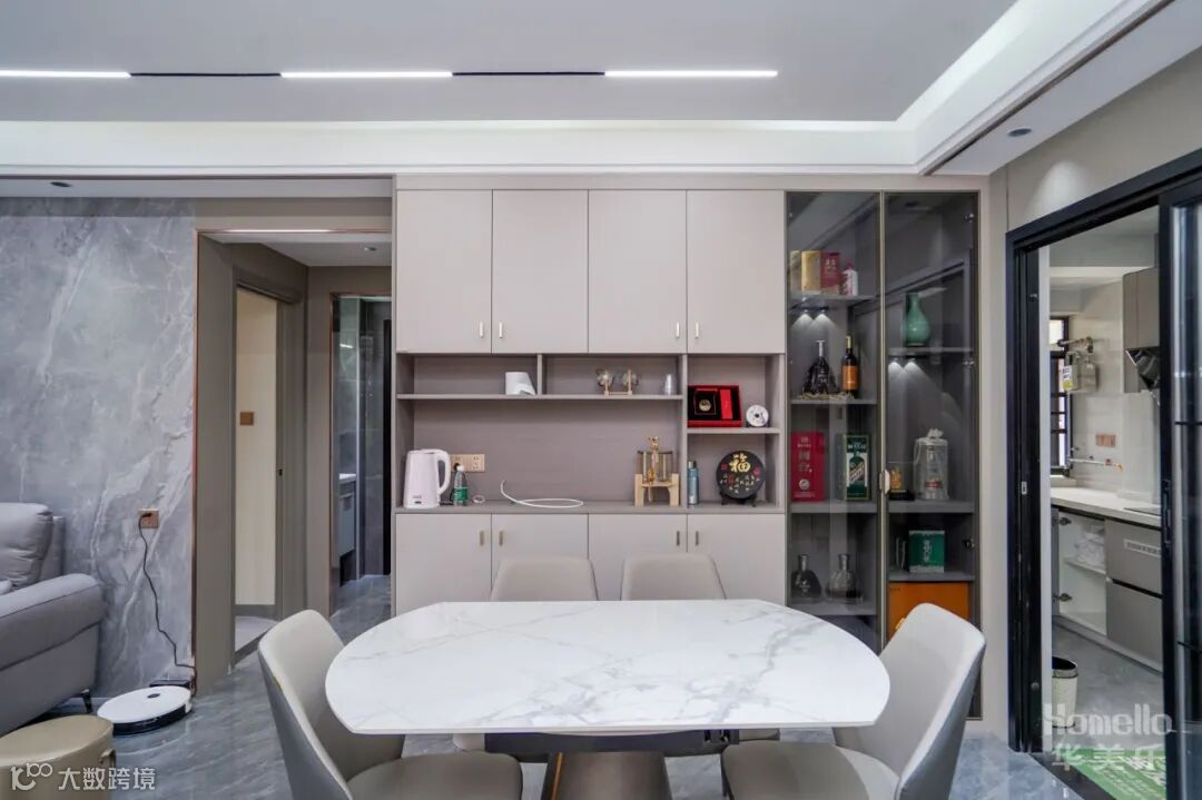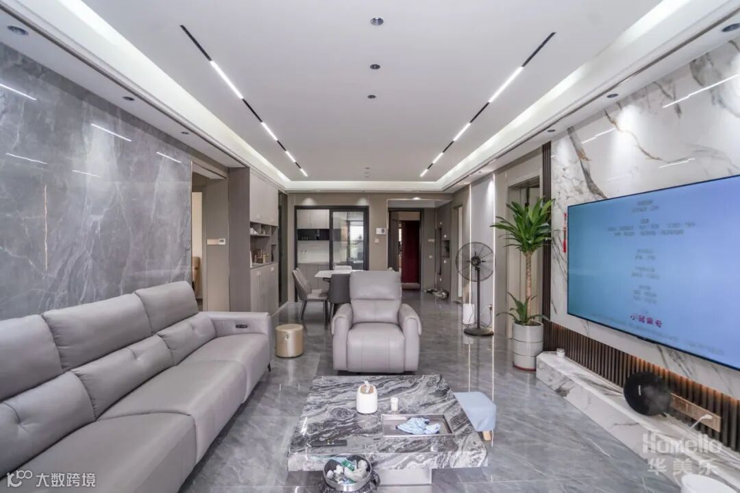 通铺高级亮面瓷砖,借用光的倒影打造客餐厅的呼吸感与现代感。暖灰色调的软装搭配削弱部分光感,更萦绕出温馨雅致氛围。