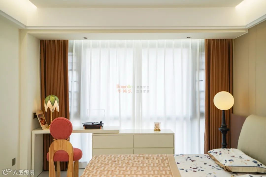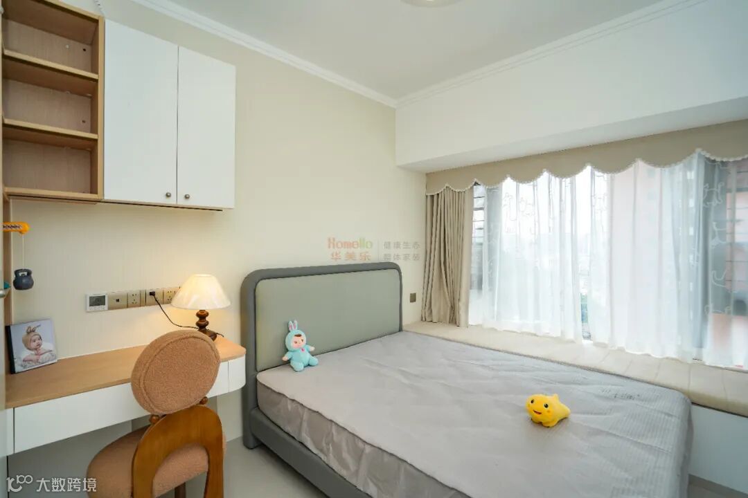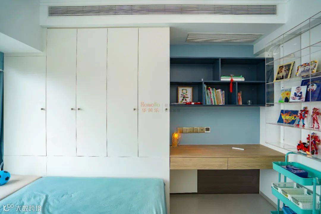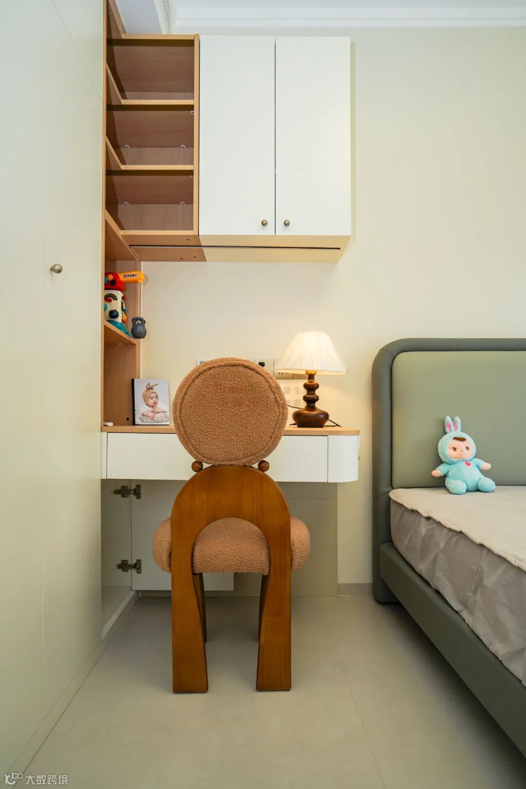 小孩房的衣柜与床体做造型相衔接,左侧置入书桌、收纳柜,满足孩子的日常学习和绘本玩具收纳,强化的储物功能下亦不缺失空间的美感与体感。