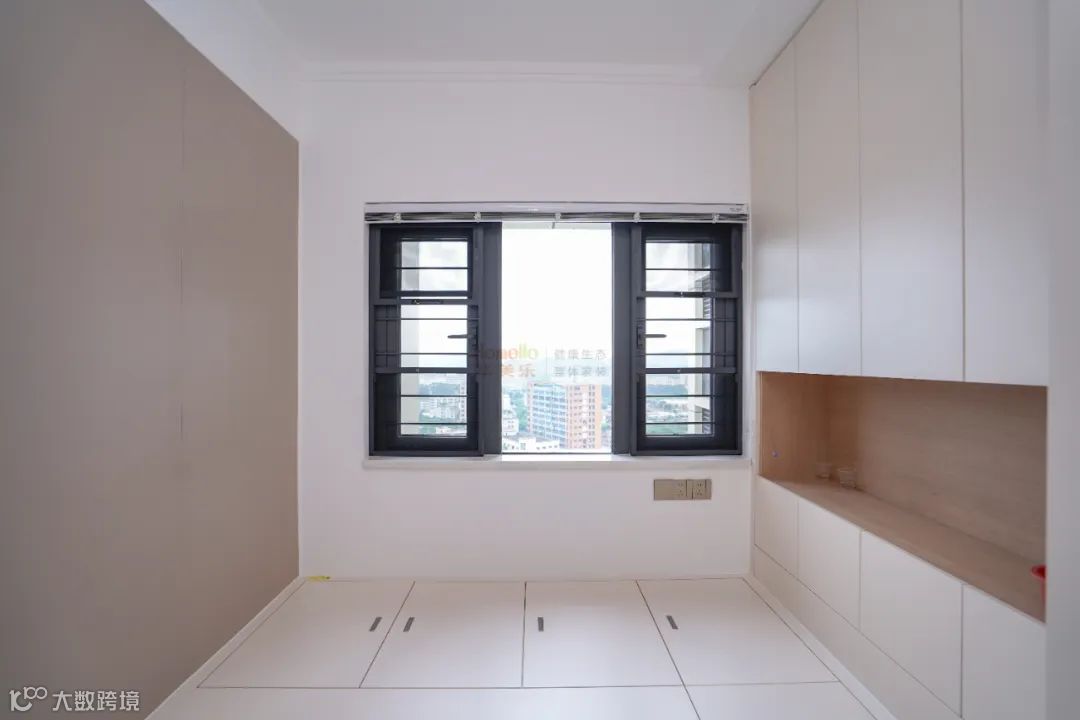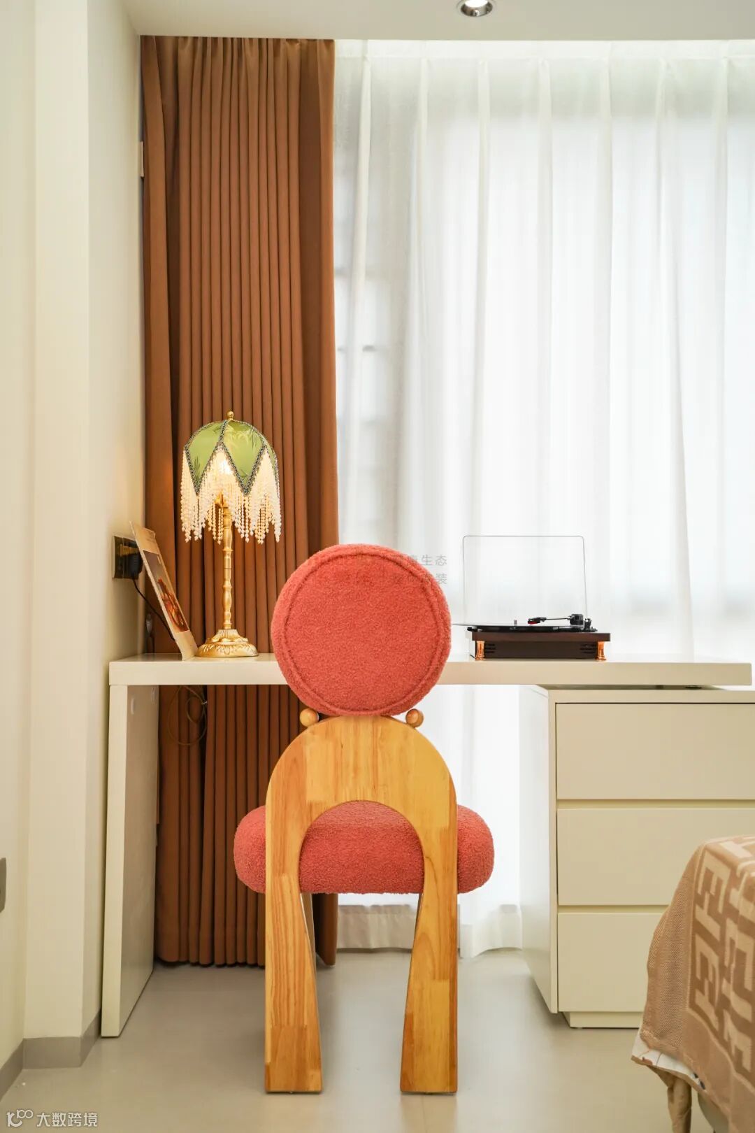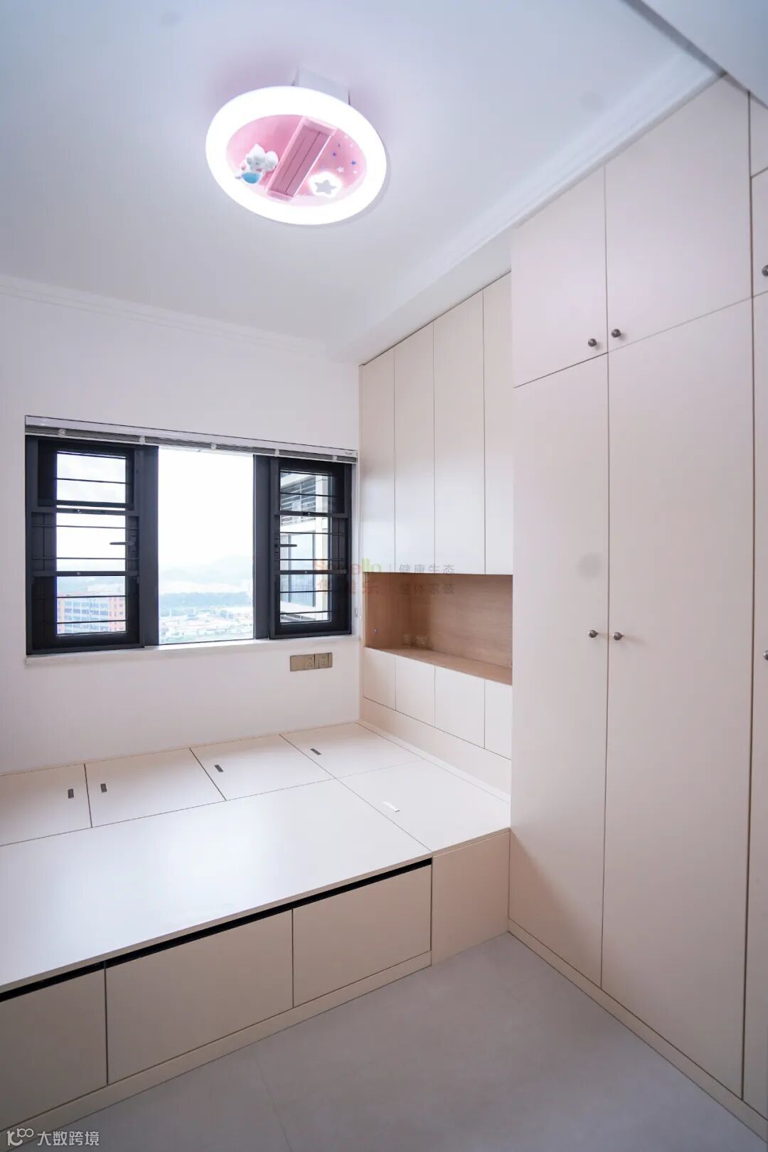 小孩房的衣柜与床体做造型相衔接,左侧置入书桌、收纳柜,满足孩子的日常学习和绘本玩具收纳,强化的储物功能下亦不缺失空间的美感与体感。