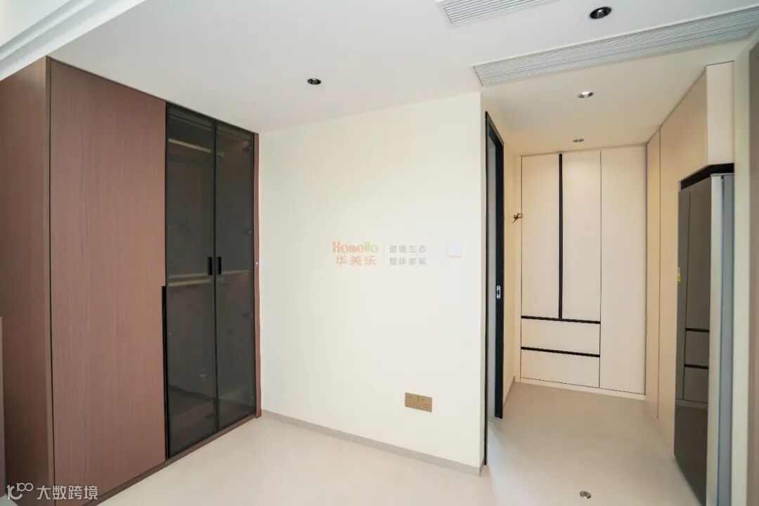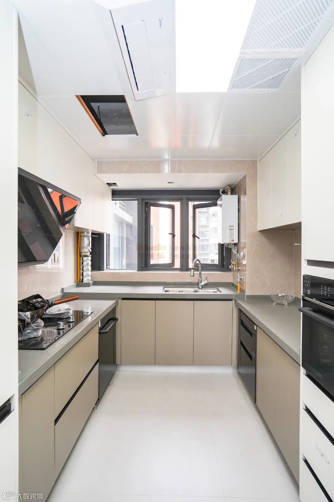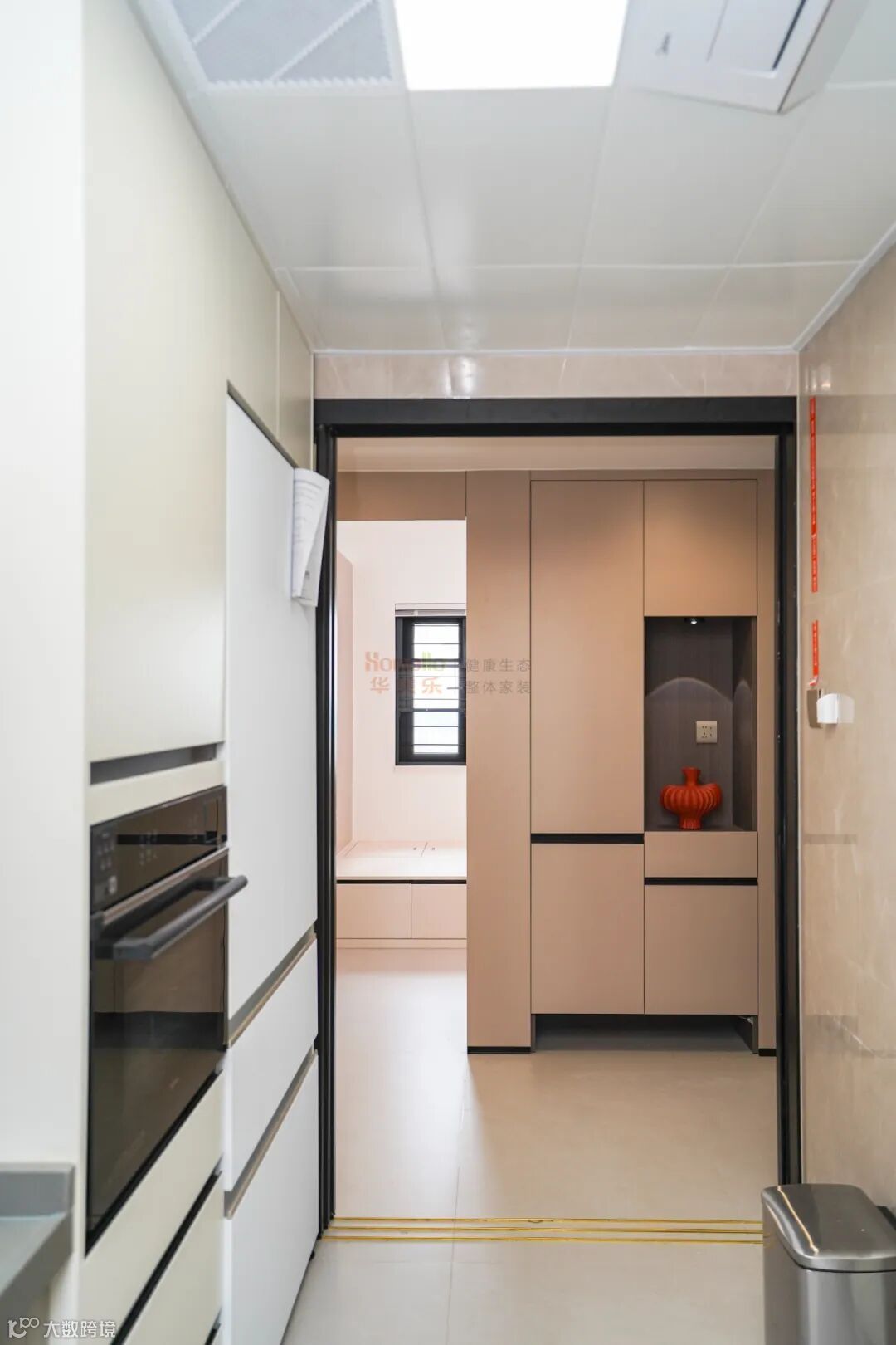 厨房门换了个位置,由正对餐厅改成正对玄关,能让U型橱柜做得更大更能装。