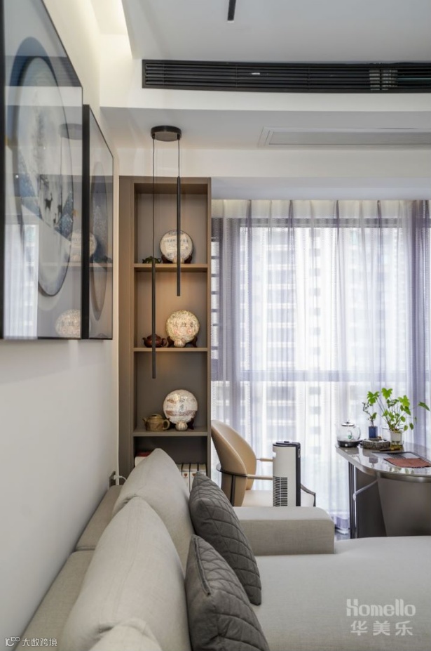 双阳台的户型结构增加了空间的光感,弧线的介入中和了空间的气场,客厅