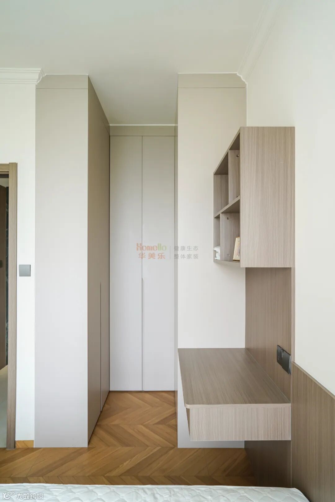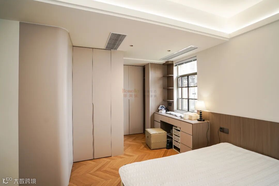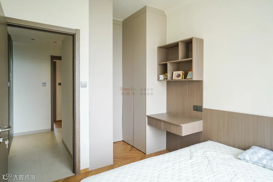 衣柜与床体做造型相衔接,左侧置入书桌、收纳柜,强化的储物功能下亦不缺失空间的美感与体感。