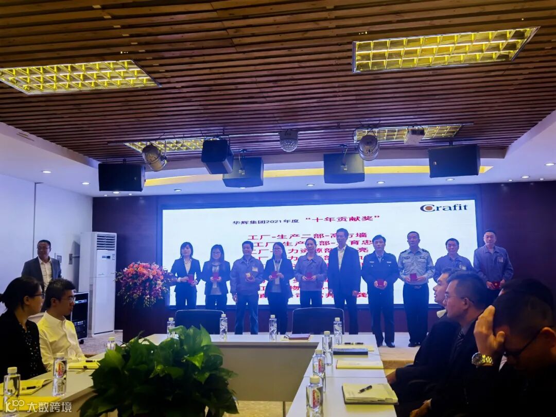 林董首先肯定了子公司及事业部在2021年所取得的工作成绩。工厂积极突破整装定制业务,营销公司形成有竞争力的经营模式,直营公司创新建店模式,三水工程顺利进展,监利意驰家居积极筹备,等。表扬了获得“十年贡献奖”及“集团2021年度激励奖项”的优秀员工代表们,赞扬了他们所代表的华辉人的智慧拼搏精神。