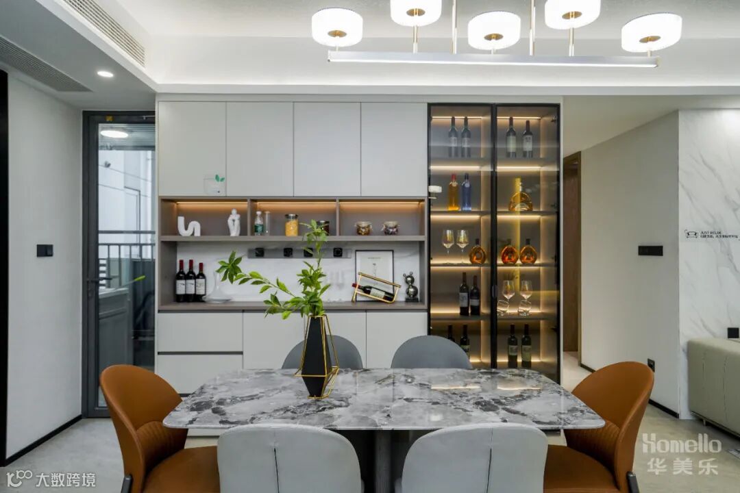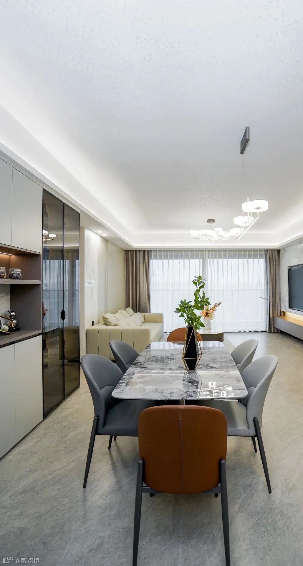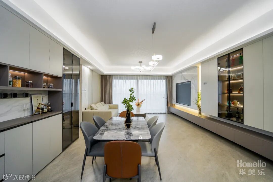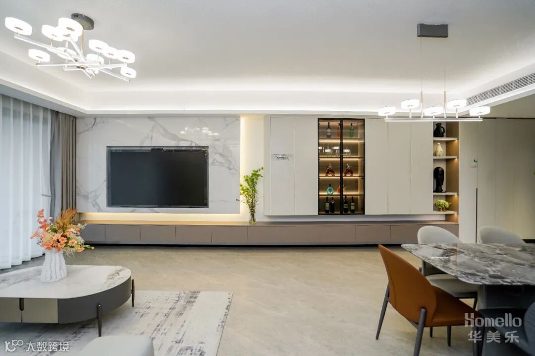电视背景墙+餐边柜+玄关鞋柜一体,并配以LED灯带,大气时尚。整个客餐厅色彩协调且富有质感,充分体现出主人对高品质生活的追求。