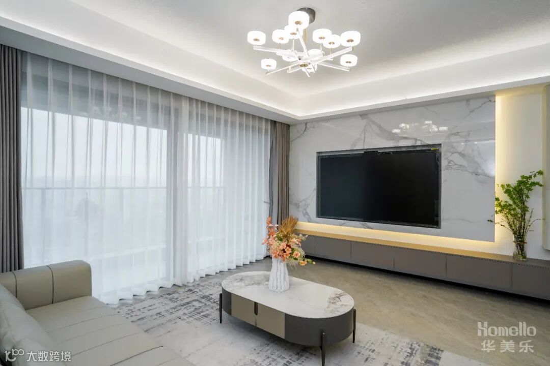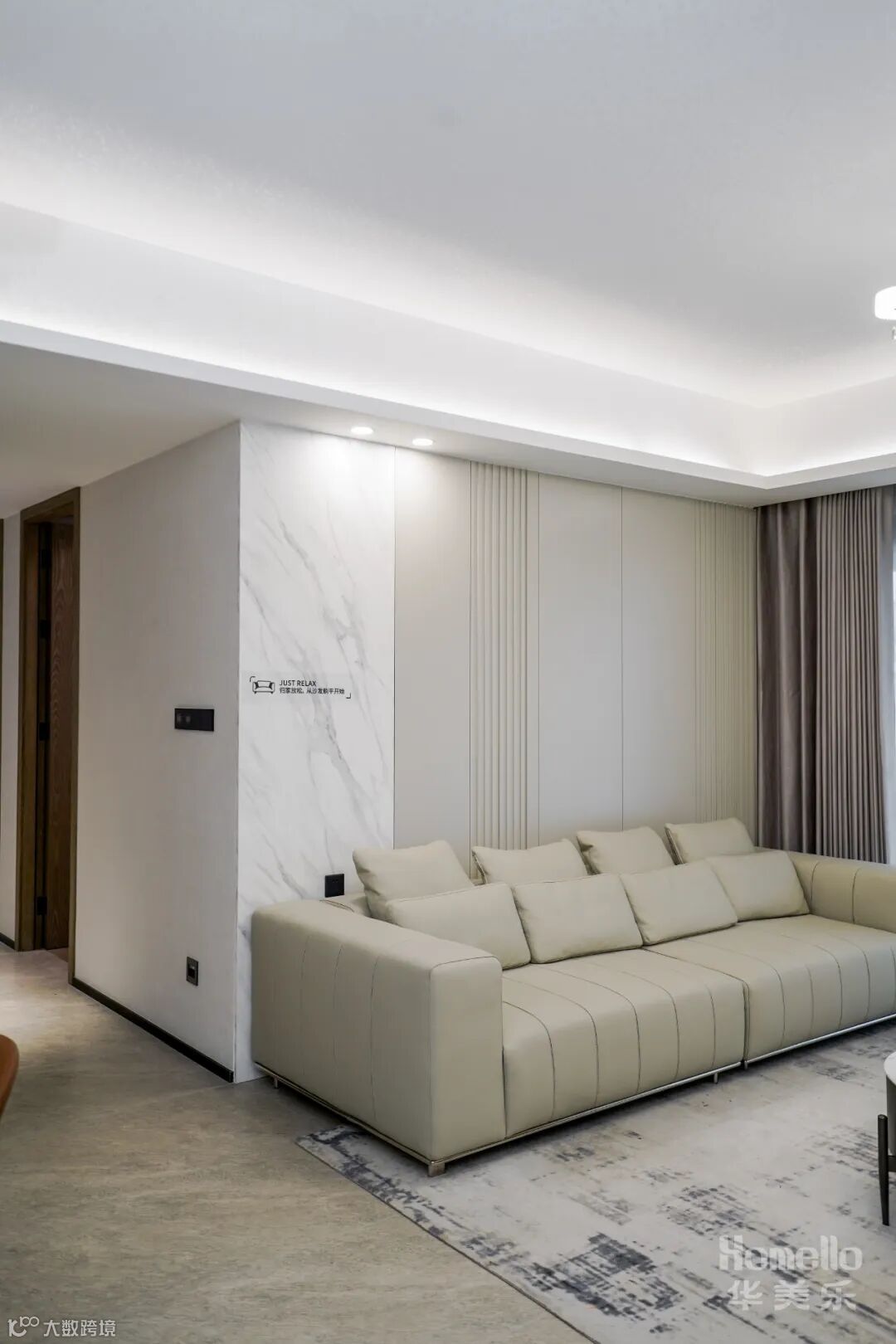 沙发背景墙采用岩板和装饰板,简约好看又有质感。