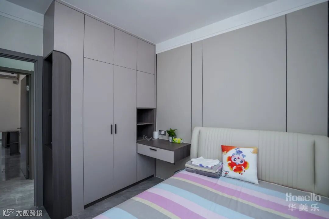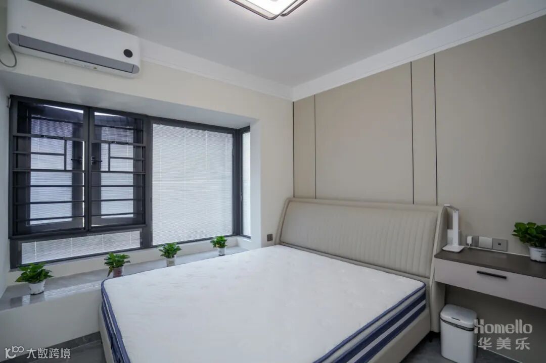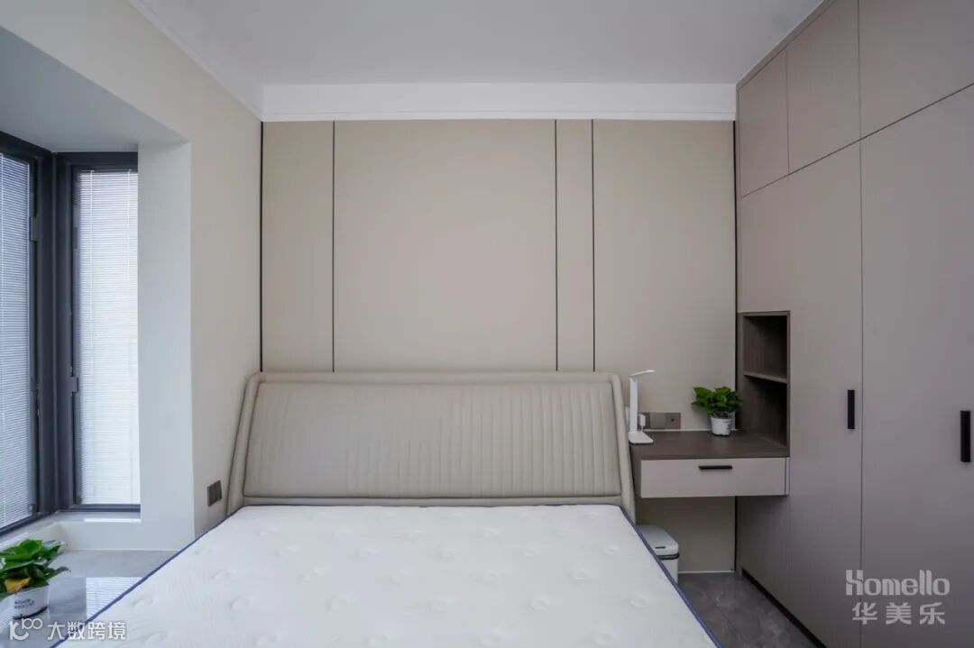 卧室空间拥有着良好的通风与采光条件,柔和的莫兰迪色,沉静宁谧,很容易让人安下心来。做了与衣柜一体设计的悬浮床头柜,下面留空,还可以成为应急书桌。
