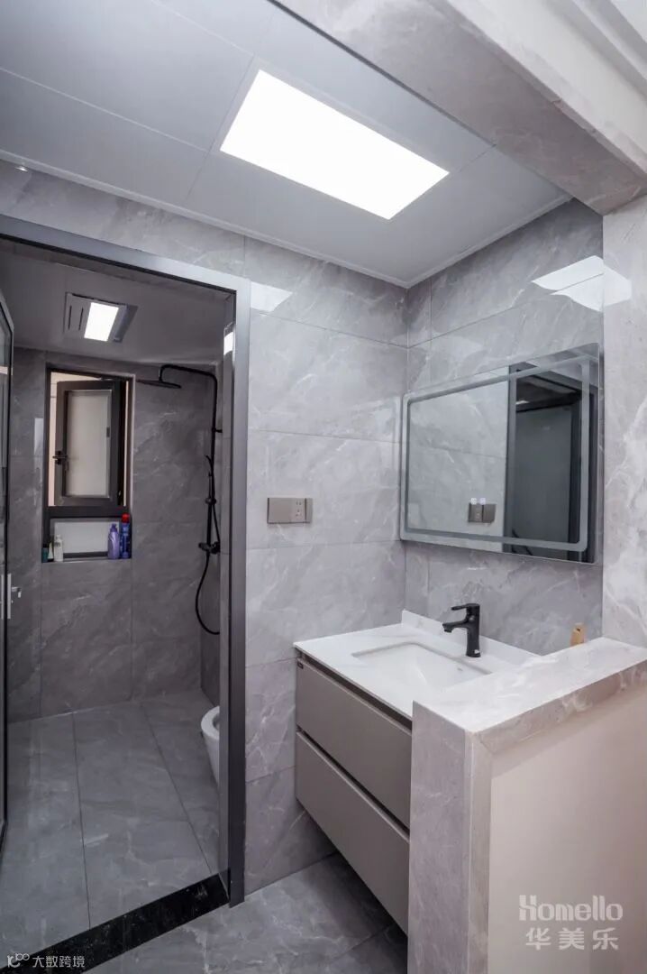 洗手台外置,抽屉柜悬空下方可摆放洗涤用品,很好地划分了干区区域的同时,增加空间趣味性。