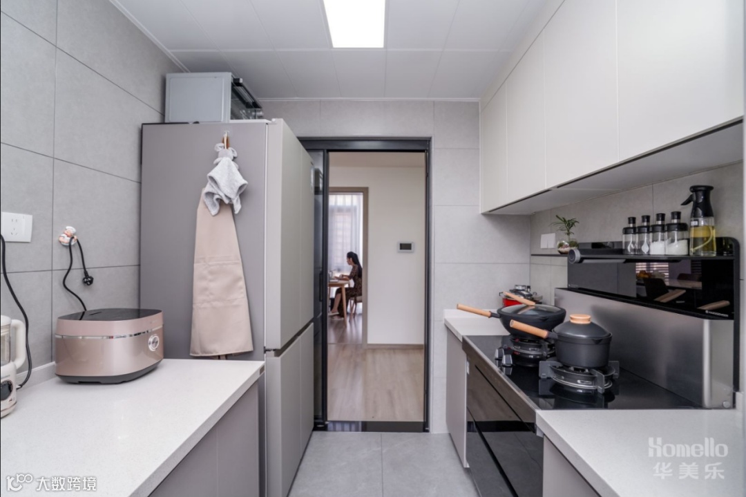 次卧衣柜与书桌定制一体,书桌往柜体内部延伸的方向开放式的书柜,与桌面0距离,方便拿取。另外,将更衣和学习两者动线融合在了一起,行为切换上方便,另外不会妨碍到任意一者使用的空间。