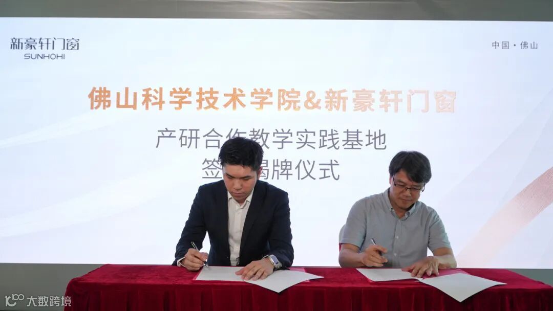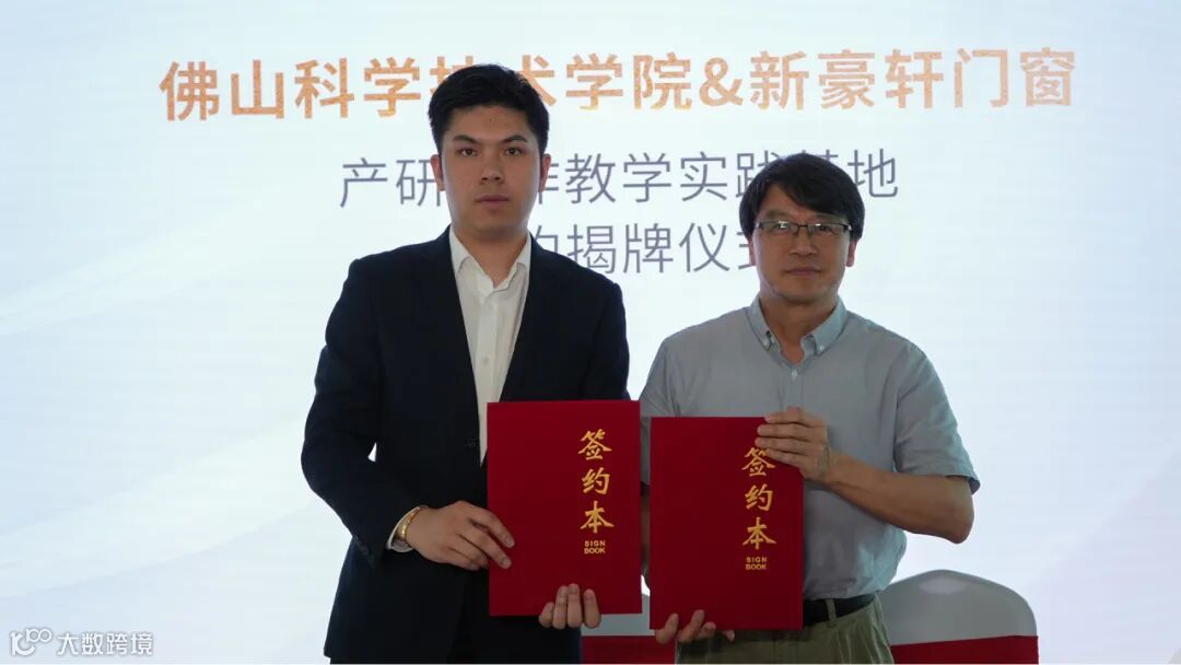 在全场瞩目之下,佛山科学技术学院设计学院院长范劲松、新豪轩门窗总裁冯佐星作为双方代表,完成双方产研合作签约仪式。