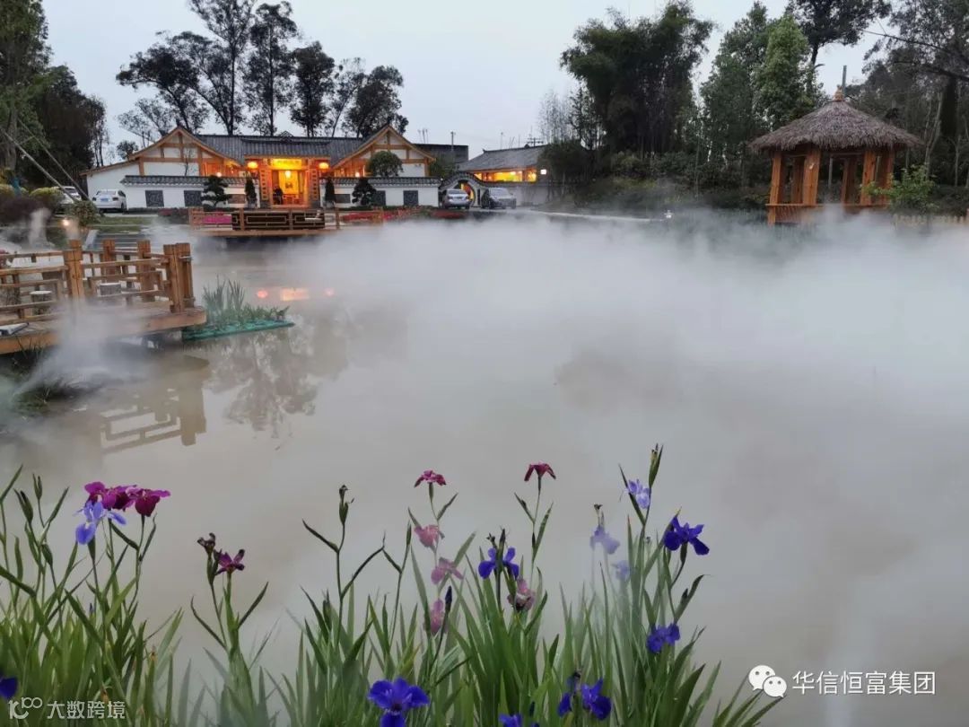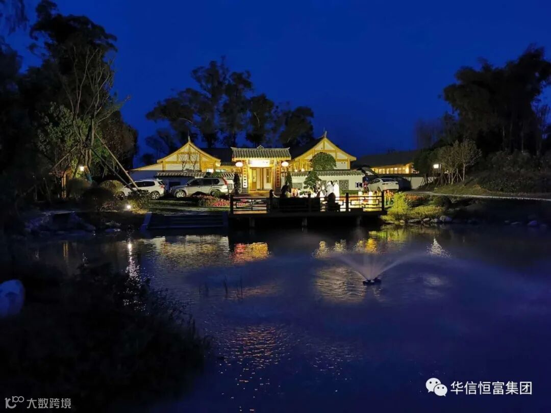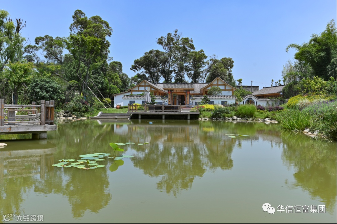 整体建筑以川西民居、三合院、白墙黛瓦、古朴风格为基調,依據中國傳統文化風水理論,“前明堂,后靠山”的方式,于屋前开凿了“阿兰那”小岛池塘、屋后堆填小山坡及栽种高大树木遮挡北风。