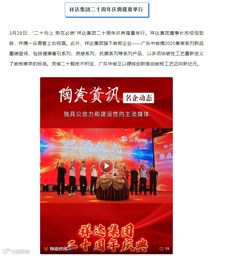 2025年3月28日,《二十向上,势在必燃》祥达集团二十周年盛典活动在万众瞩目中完美谢幕,在这个意义非凡的日子里,宾朋满座,共同回顾祥达集团二十载的奋进征程与辉煌成就。来自全国的供应商、经销商、合作伙伴、行业媒体/协会、社会各界嘉宾以及祥达家人们,欢聚一堂,跟祥达一起燃势、升维、跨越!