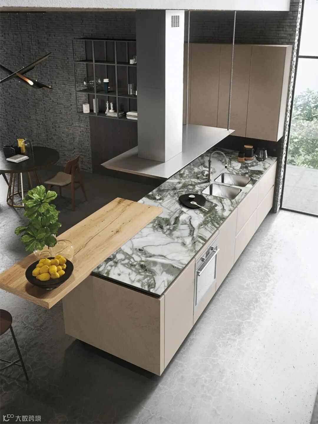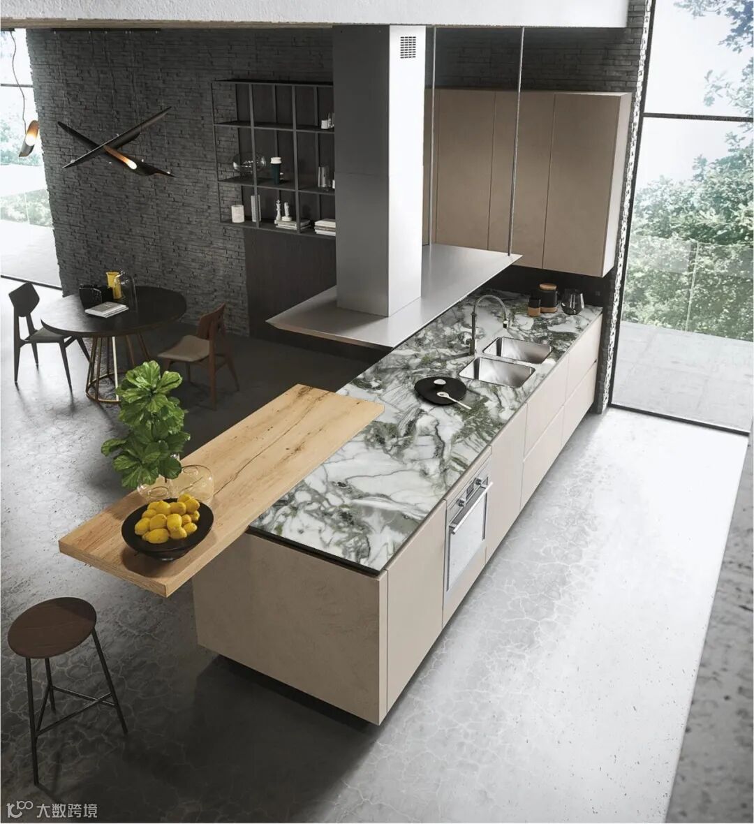 把普拉达绿作为背景墙,让空间像是镶嵌了宝石一般,丰富了空间的纹理层次。与软装搭配,减少了冷硬质感,更加充分展现它的美感。台面用上「普拉达绿」,色调清新自然,搭配极简主义的设计风格,让人更容易在空间中放松身心,摒除外间的纷扰,去捕捉一片翠绿中的自然闲情雅致。