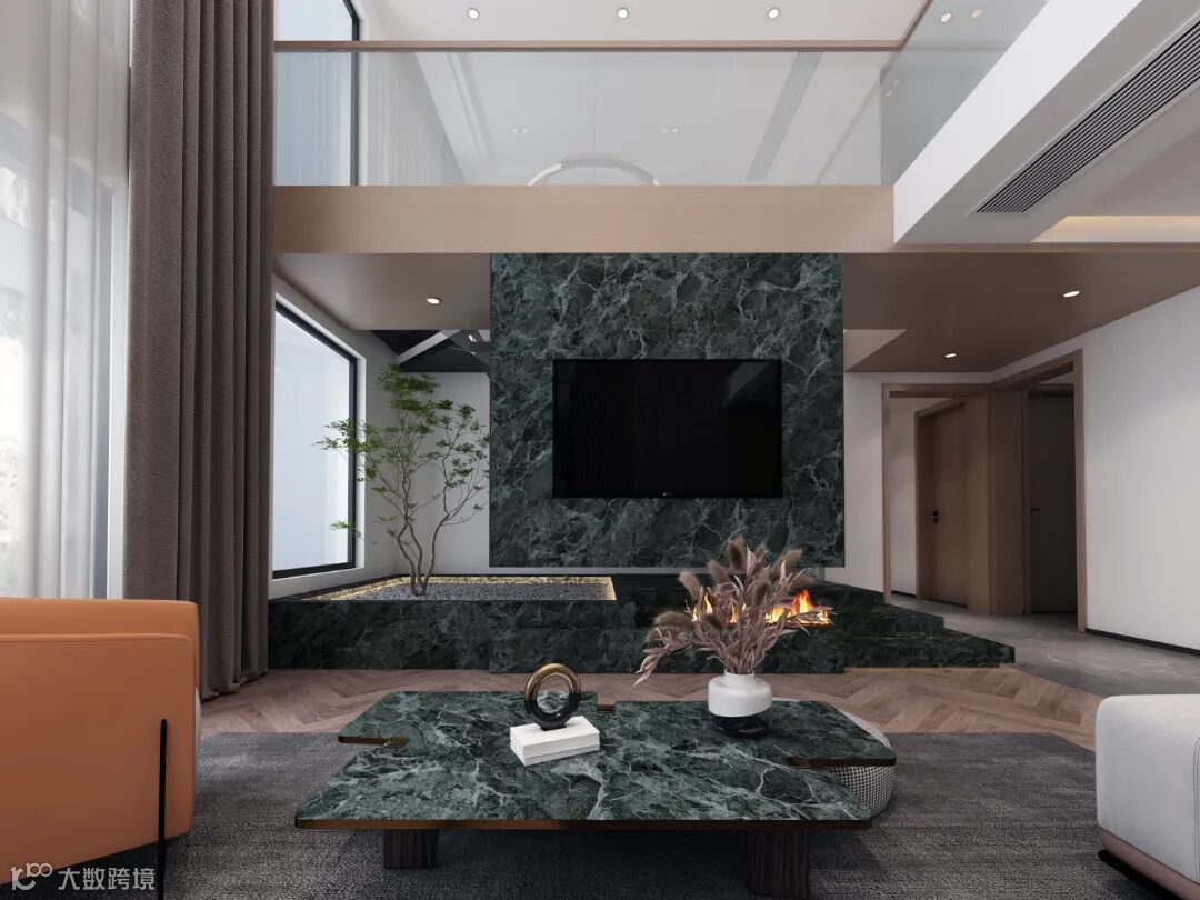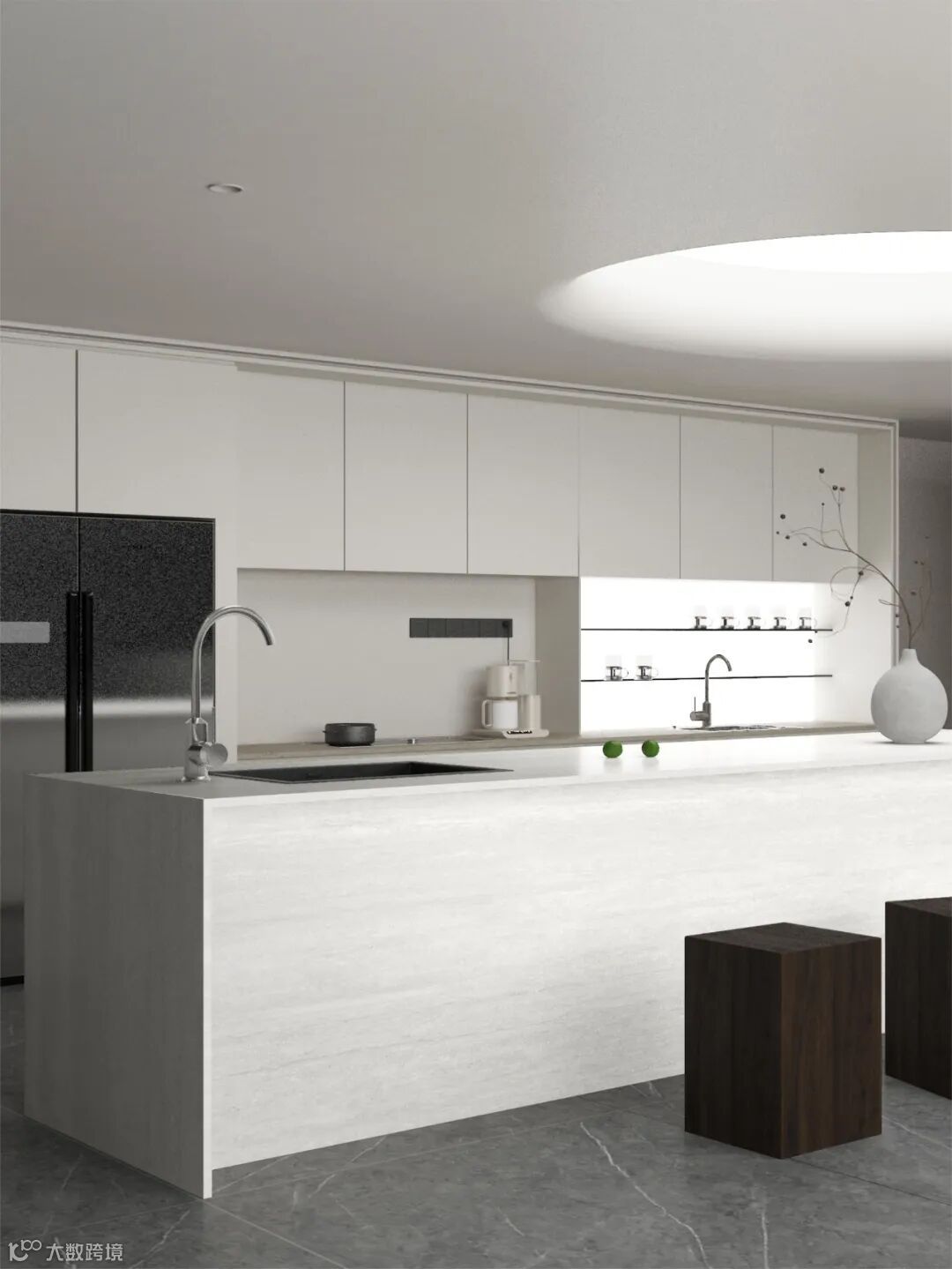 乳白为底,缀以青翠墨绿,清灵成诗,莹洁似玉,冷冽的气质中浸润着柔和,淋漓尽致地展现了天然石材的独有气质,更有一种“广阔天地 我独悠然”的豁达之感。冷翡翠将生活与艺术充分融合,勾勒出空间的别致与品位,赋予空间大气恢弘的磅礴之势,在视觉感中彰显生活的姿态。