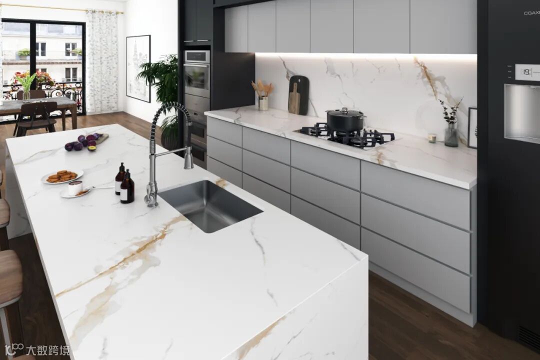 卡拉拉金纹理高雅华贵通体润泽,大面积乳白打底,奠定空间温润的基调,搭配鲜明的灰金流线型纹理,运用在厨房台面、岛台,整体给人一种优雅大气,又不失温馨,在日常的家居生活中,也能表达独有的时尚态度。