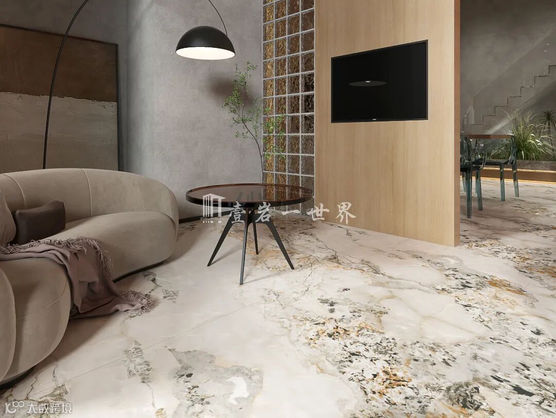 张扬的金丝线横穿版面,浑然天成,与不可复刻的山脉肌理互相缠绕,既有磅礴之气度,亦有柔和之意蕴,刚柔并济,尤为灵动。