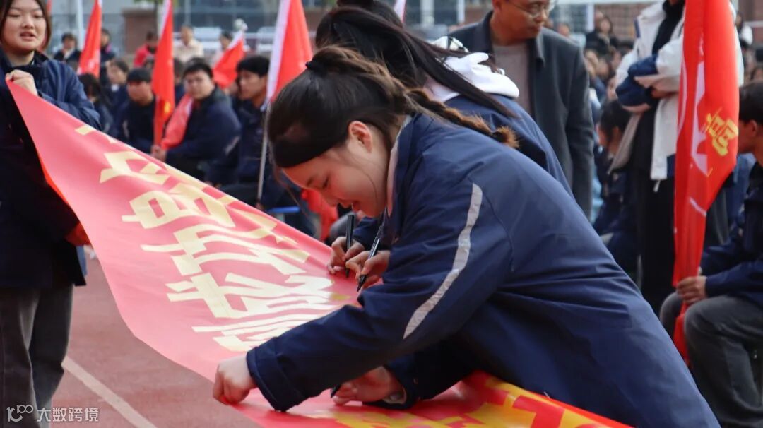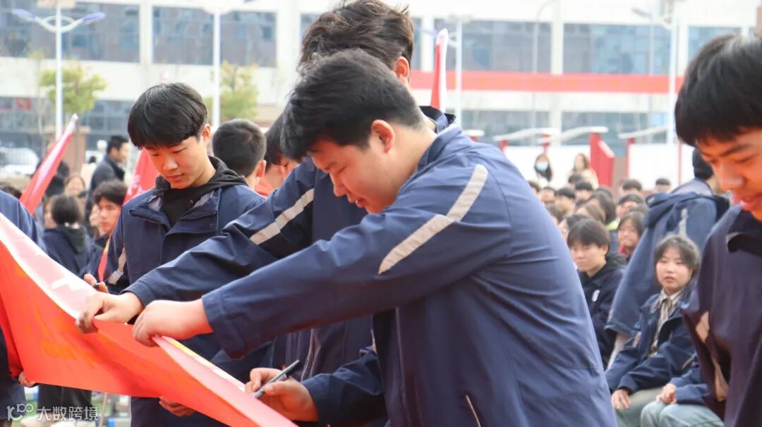 全体师生宣誓,宣誓声响彻云天、催人奋进,同学们喊出了永不放弃的决心,也喊出了一往无前的勇气。全体高三学生在条幅上签上自己的名字,同时写下心仪的院校。这一仗,是青春冲刺的奋力一搏;这一关,是叩开未来的旗开得胜。