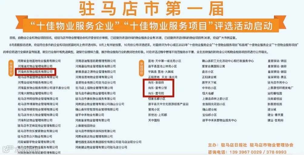 近日,在驻马店市住建局的大力支持下,驻马店日报社与驻马店市物业管理协会联合,决定在我市中心城区及九县(区)开展“双十佳”物业服务企业及项目评选活动,河南尚东物业服务有限公司及管辖的三个项目——尚东•壹号院、尚东•壹号公馆、尚东•金御府参加了此次评选活动。