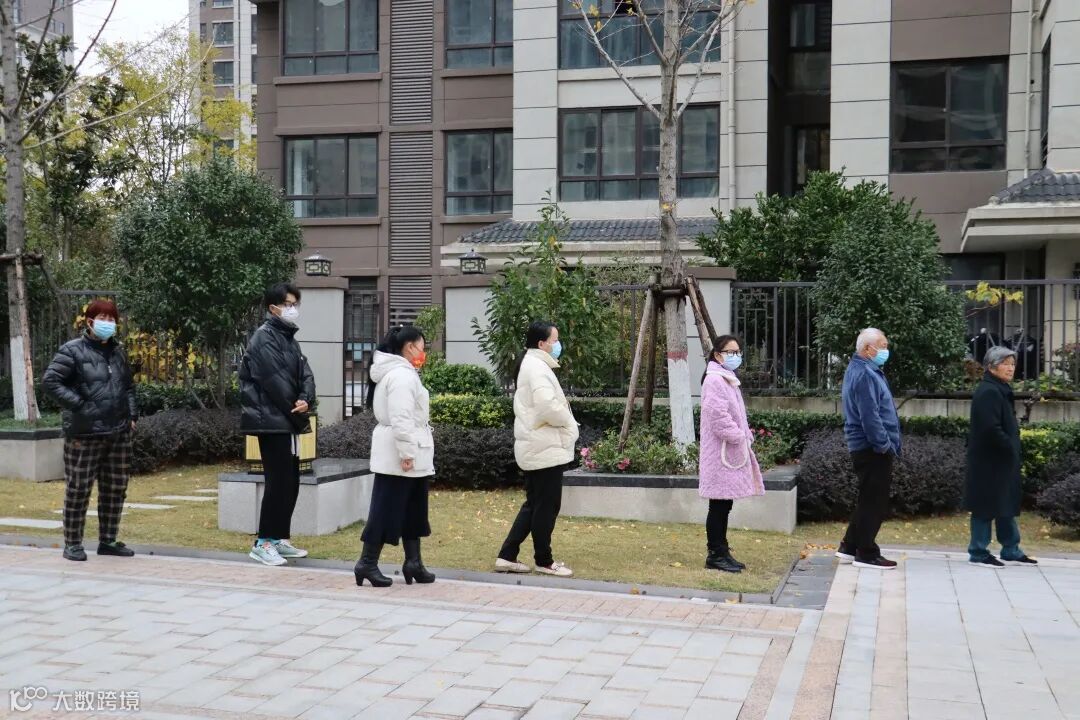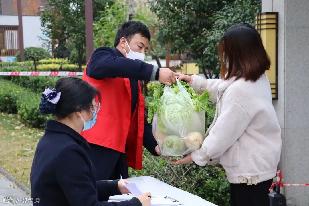 ▲业主们严格间隔2米距离开心地领取蔬菜