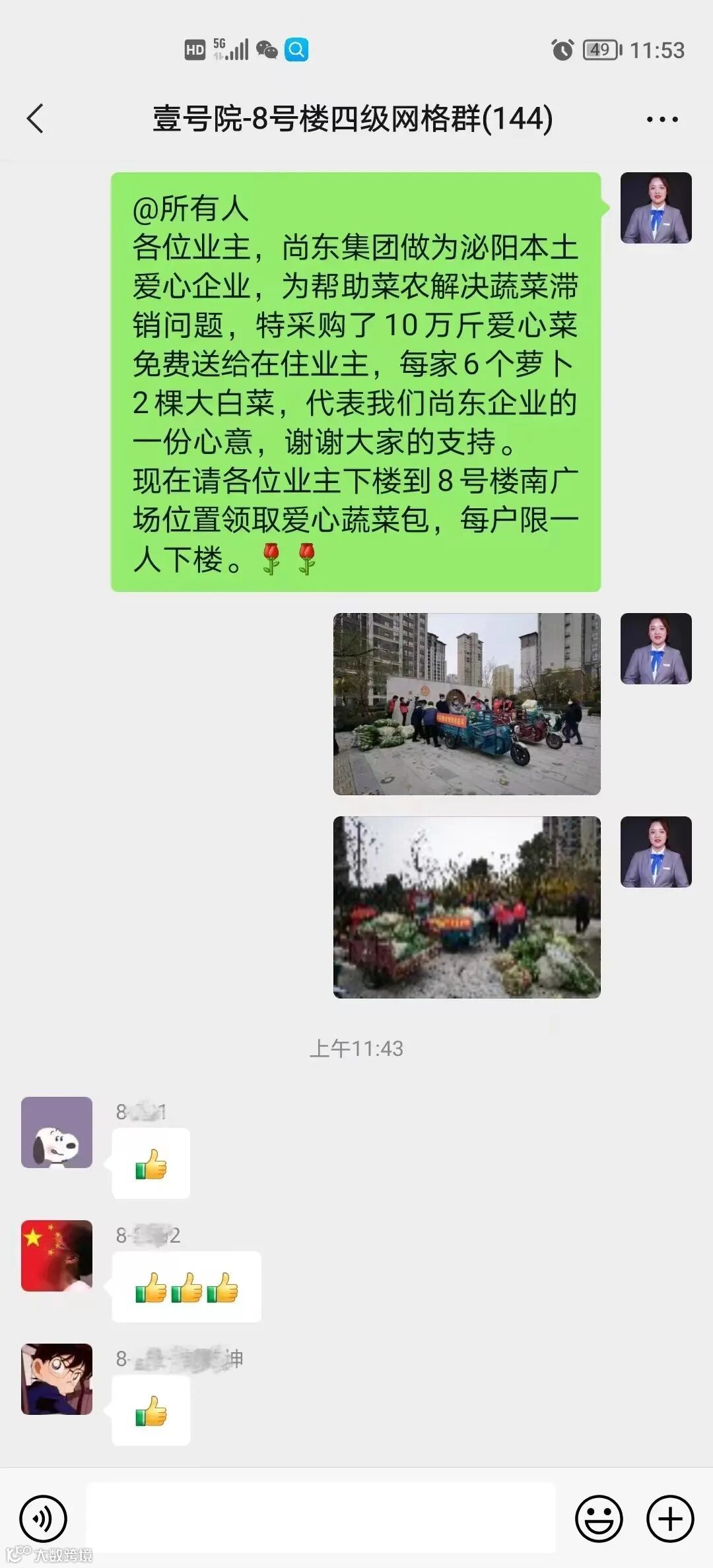 尚东集团通过泌阳融媒体中心了解到菜农当前面临的难题,秉承尚东多年来的公益精神,迅速成立“公益小组”,第一时间安排人员实地调研,与融媒中心、乡镇府对接协调,并启用专项资金首批订购十余万斤蔬菜,决定免费发放给旗下各小区近8000组业主,既解决菜农们的燃眉之急,又能满足疫情下业主们的日常生活所需。