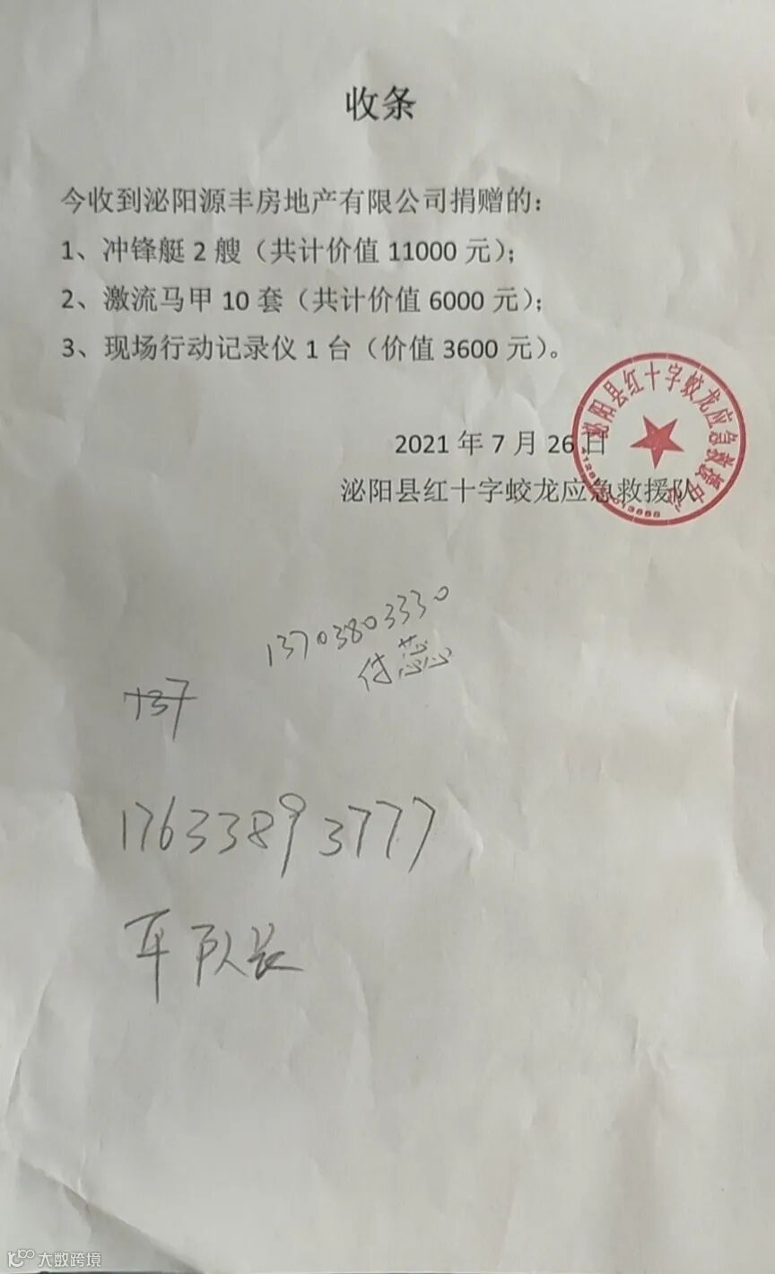 本次活动中全体员工捐款40000元,公司捐款120000元,所有捐款共计160000元,其中139400元捐至河南省红十字会(捐款电子回单如下图所示),捐赠泌阳蛟龙救援队冲锋舟、专业激流救生衣等救援设备共计20600元(捐物收据如下图所示)。