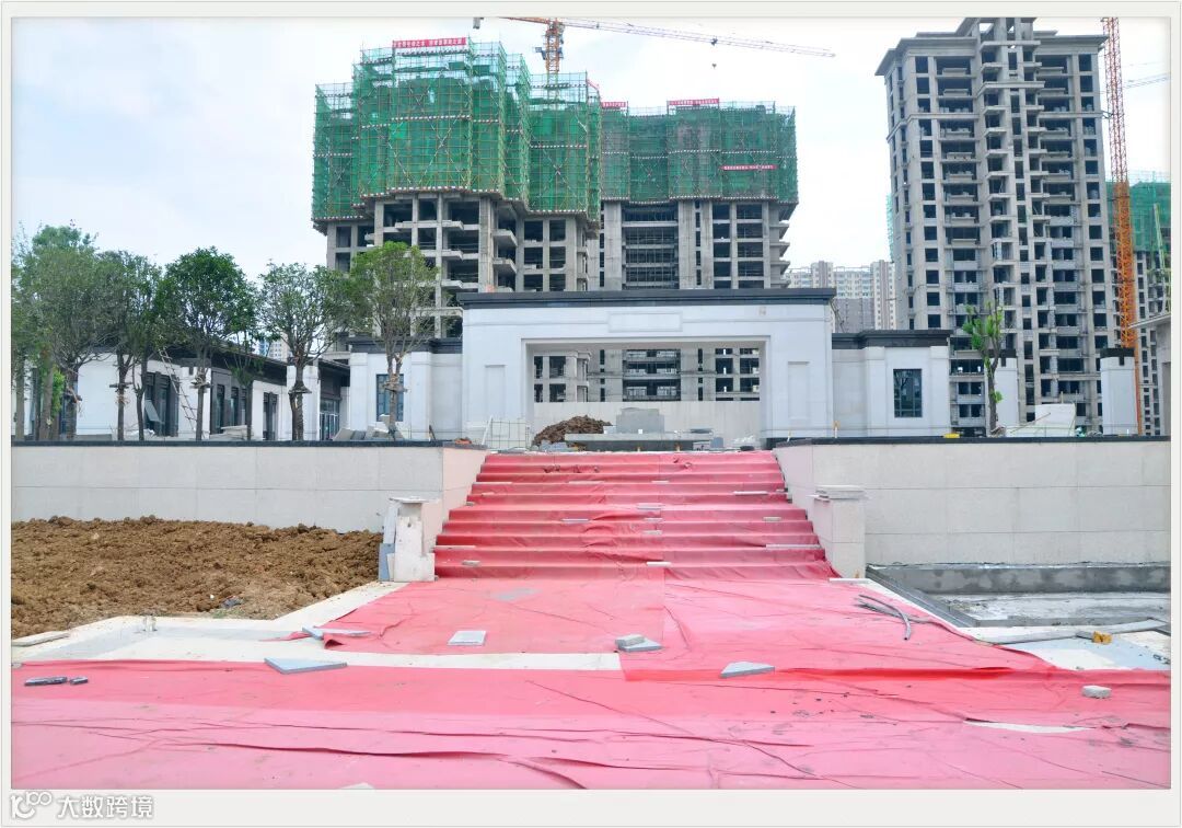 景观示范区已初具雏形,地面及外立面已基本铺设,景观树木也在陆续移植栽培中