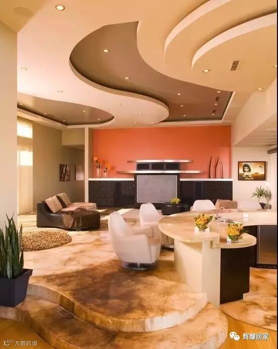 视觉特点:弧线吊顶常要围绕空间走一圈,但线条多是弧形或波浪形的。
