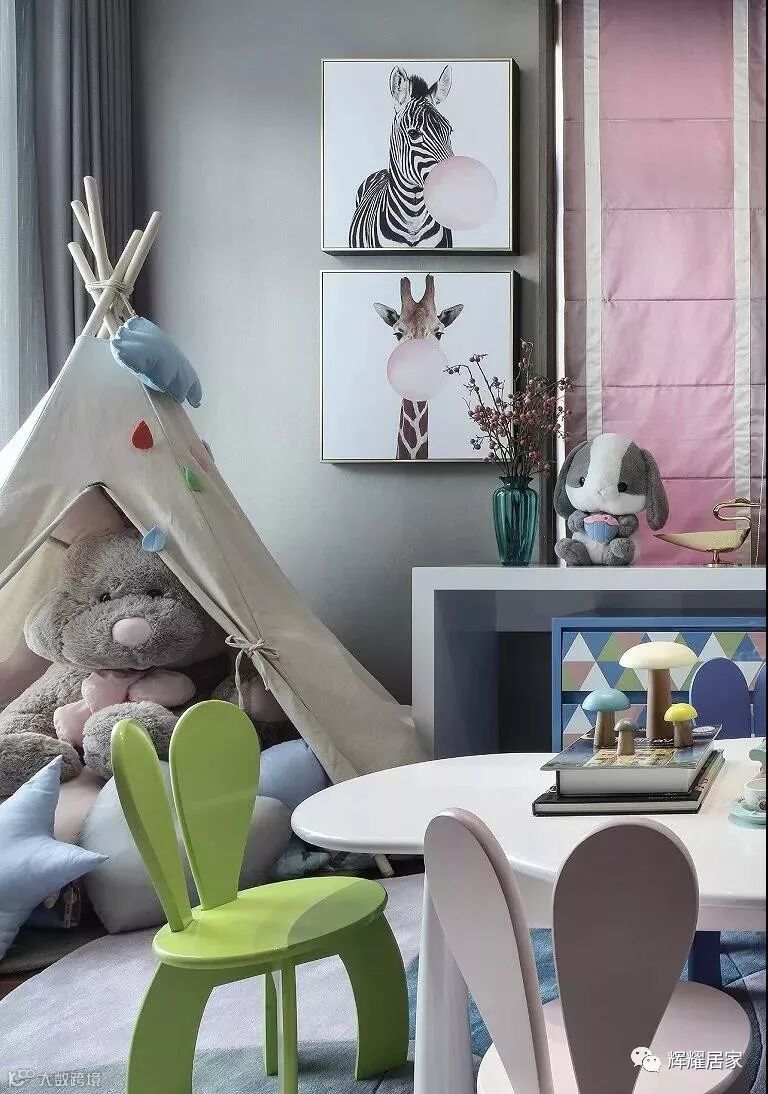在儿童房设计中,经由马卡龙色调的清甜组合,一个甜美温馨的童话乐园于此诞生,柔软温暖的的拼布地毯上,安放着粉白相间的小床,一切的一切,仿佛都在共同制造着童年轻快的幻梦。