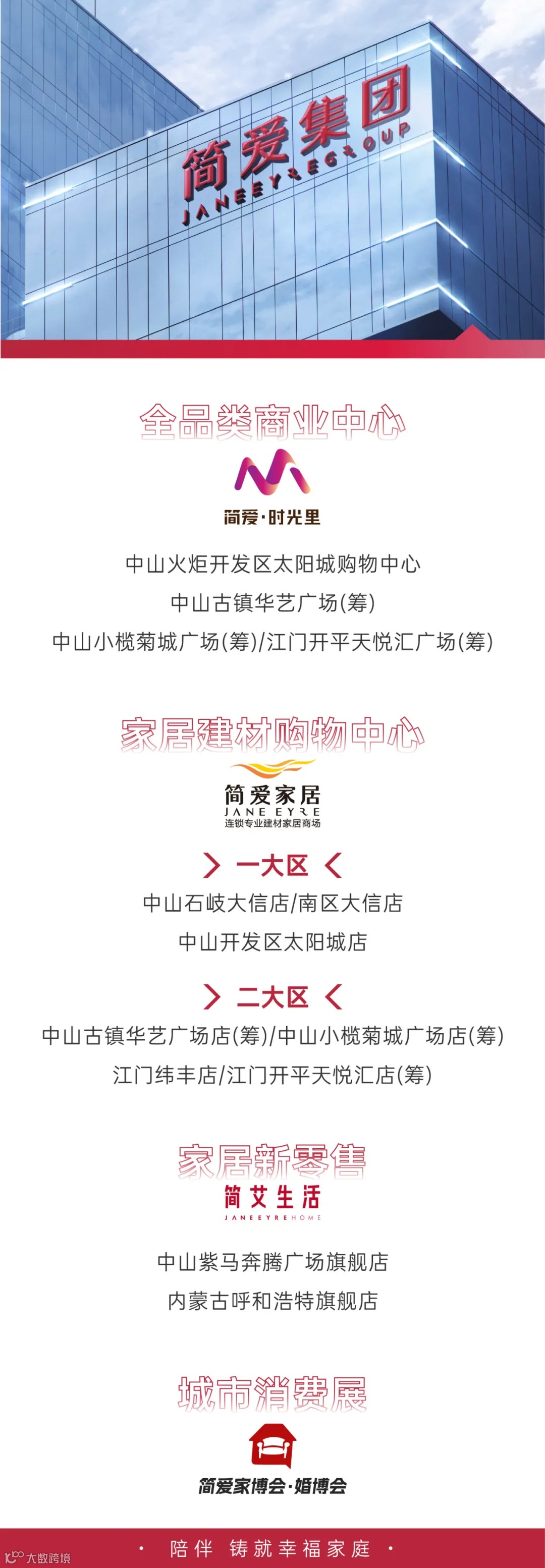 以“家庭”为核心,打造高品质家居生活与优质购物平台:全品类商业中心「简爱·时光里」;家居建材购物中心「简爱家居」;城市消费展「简爱家博会」;家居新零售「简艾生活」。