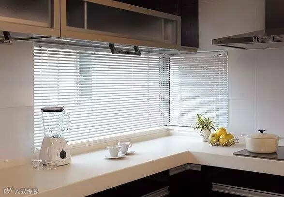 厨房的窗帘选择应优先考虑具有良好的隔油防水、遮阳、隔热、透气防火及易清洗的材料,镁铝合金百叶帘、针孔铝合金百叶帘是上乘之选。尽量不使用布艺窗帘,避免在沾染油污后不易清理。