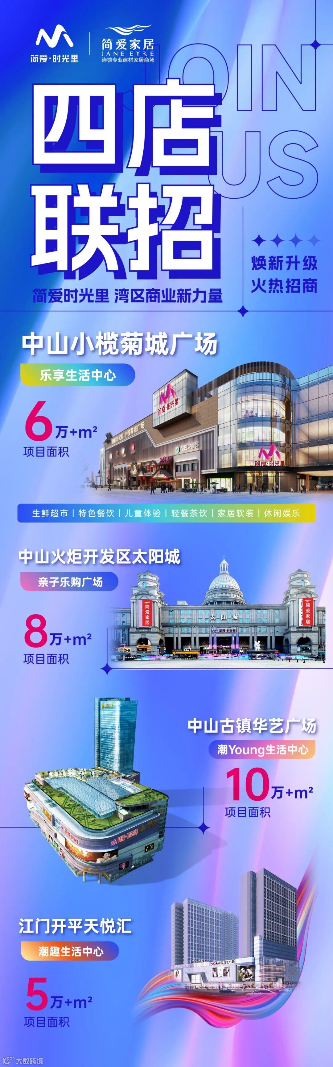 新零售时代,中国连锁家居购物中心「简爱家居」转型多元化商业综合体,创新打造家居 + 零售商业组合「简爱·时光里」,精选湾区核心腹地,塑造珠三角商圈城市新地标。简爱·时光里跨界融合轻餐饮、社区配套、休闲服饰、亲子教育、社交空间、美学设计等业态,主打以家庭居家生活为核心的品质商品和优质购物体验,营造“以家庭为中心”的沉浸式娱乐互动体验,打造城市生活的第三空间!