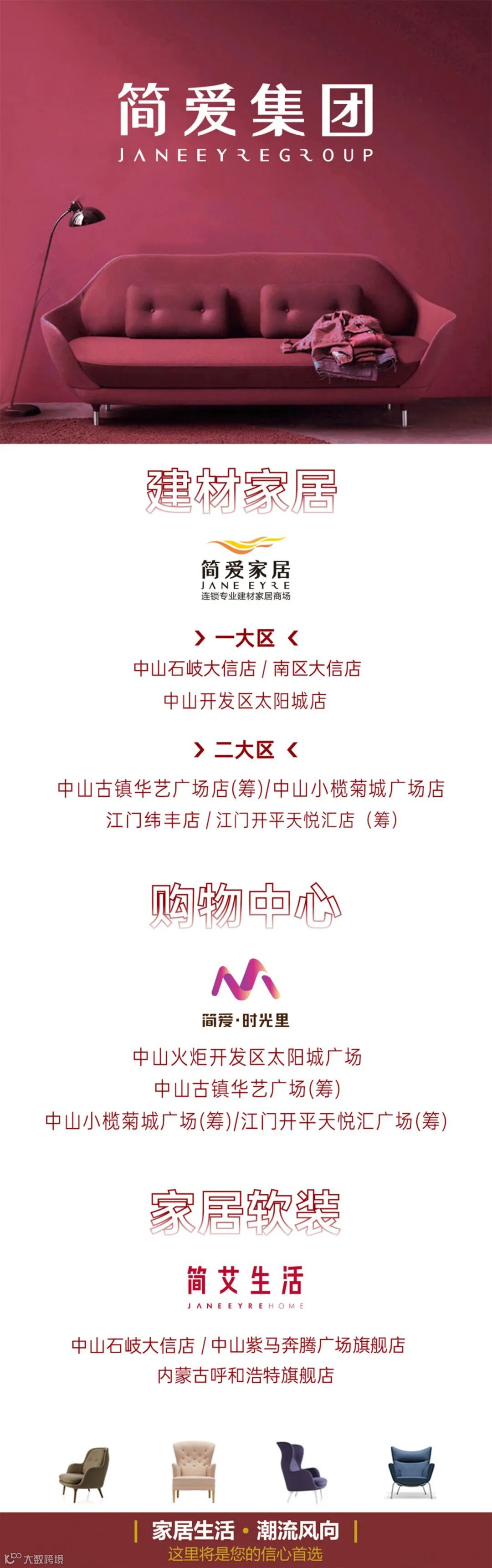 简爱集团,2007年创建于中山,是华南区域知名商业平台公司。旗下4大品牌:①专业建材家居卖场「简爱家居」;②全品类购物中心「简爱·时光里」;③展览会平台「简爱家博会」;④国际时尚家居用品超市「简艾生活」。已达成近20家连锁商场,经营面积60万平方,1200+品牌合作商,1500+核心经销商,100+商业金融合作机构,服务近100万户家庭,简爱人致力于创造美好生活而持续奋斗!