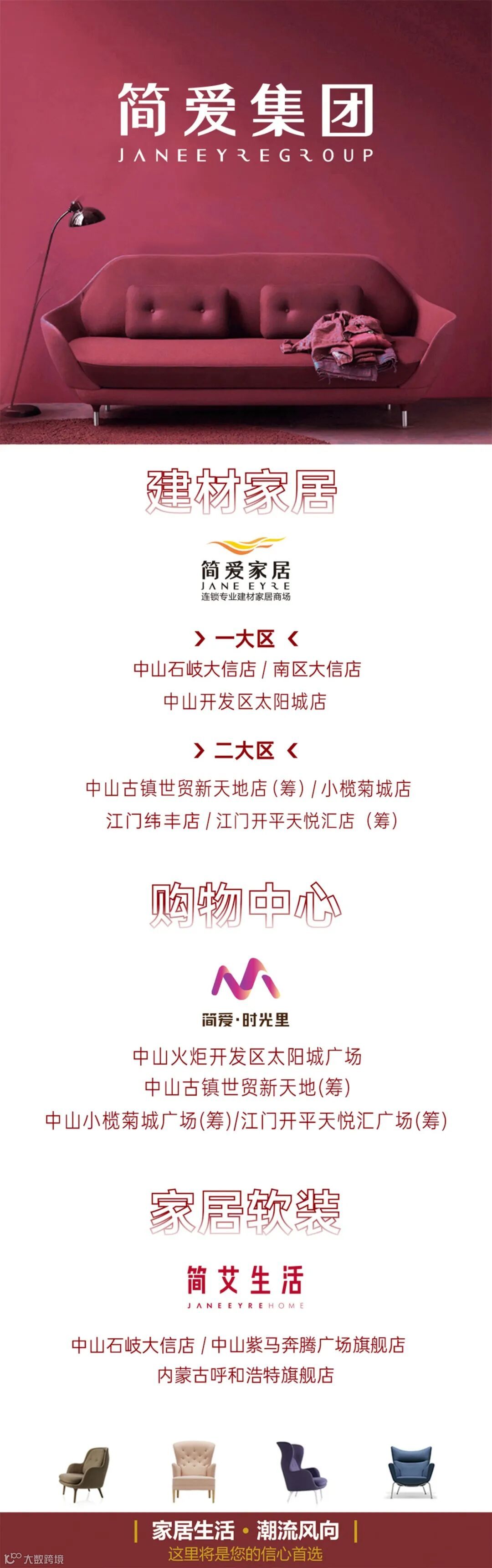 简爱集团,2007年创建于中山,是华南区域知名商业平台公司。旗下4大品牌:①专业建材家居卖场「简爱家居」;②全品类购物中心「简爱·时光里」;③展览会平台「简爱家博会」;④国际时尚家居用品超市「简艾生活」。已达成近20家连锁商场,经营面积60万平方,1200+品牌合作商,1500+核心经销商,100+商业金融合作机构,服务近100万户家庭,简爱人致力于创造美好生活而持续奋斗!