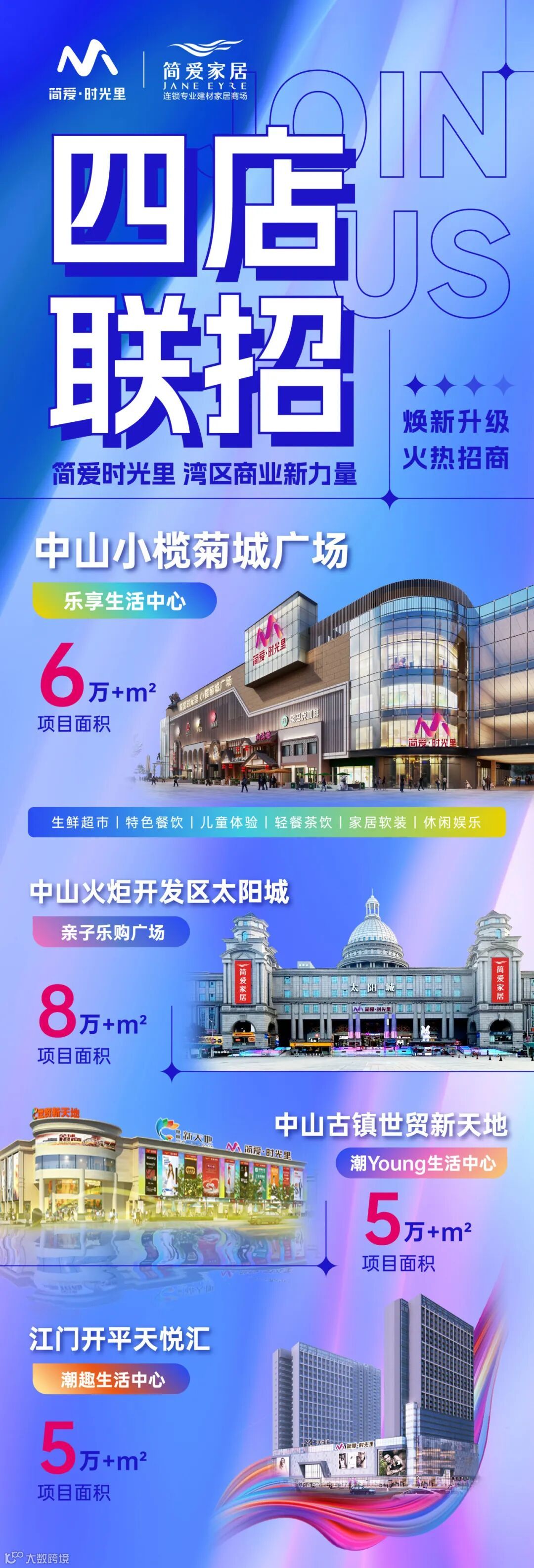 简爱家居:专注行业16年,超100亿总产值,超300场品牌落地活动,服务覆盖一亿人群。坐拥城市CBD黄金商圈千万人流,甄选500+家中高端家居品牌,倾力打造最高品质的家居生活与文化体验平台。新零售时代,简爱家居再升华,不断突破,紧跟互联网时代,升级团队,形成以90后海归新青年为核心的市场营销中心,利用新媒体平台和技术,推动数字化营销转型,构建卖场与商户之间的共同体思想,以“工厂+经销商+商场”三位一体的发展模式打造全新行业格局!携手上下游伙伴开创小而美的精致生活时代,共赢发展,创造时代裂变财富效应。