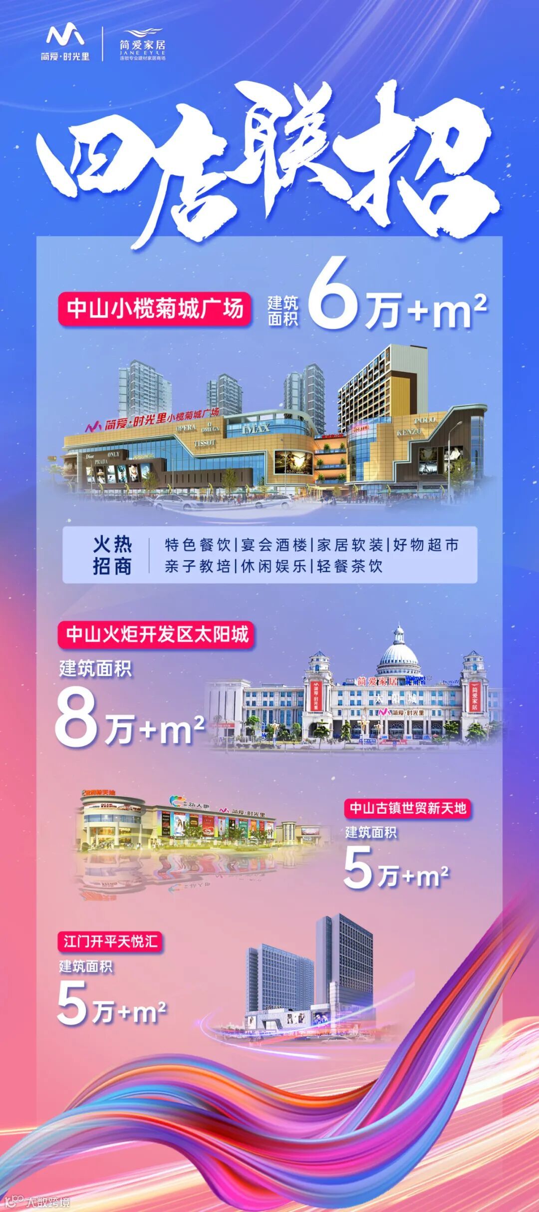 简爱·时光里小榄菊城广场位于小榄旧城区与新城区交汇中心,商业规模6万平方米,以商业购物中心+社交娱乐街区为主体。商业购物中心共地面四层,地下两层停车场,800个车位。以“乐享新生活”为项目定位,以精品超市、特色餐饮、家居好物、休闲娱乐、亲子培训、网红茶饮等为主要核心业态,结合网红茶饮、微醺夜经济,打造精致的都市生活社区及特色消费场景,围绕绿色健康生活空间、社交娱乐体验、生活配套,为小榄青年带来休闲的慢生活新体验。