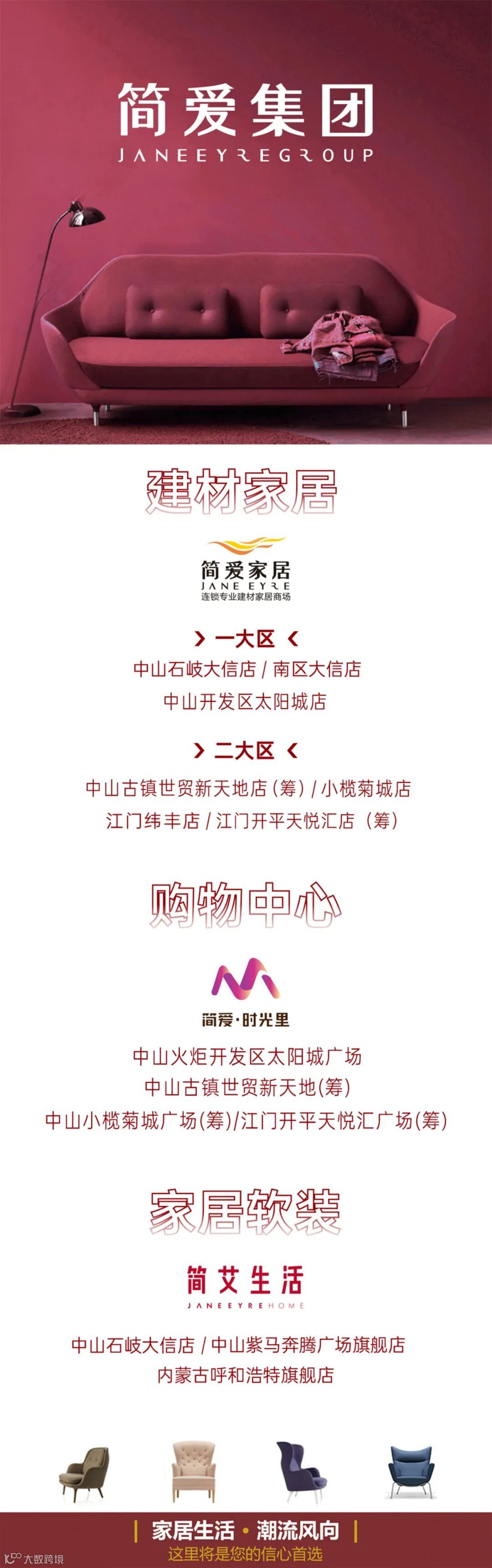 简爱集团,2007年创建于中山,是华南区域知名商业平台公司。旗下4大品牌:①专业建材家居卖场「简爱家居」;②全品类购物中心「简爱·时光里」;③展览会平台「简爱家博会」;④国际时尚家居用品超市「简艾生活」。已达成近20家连锁商场,经营面积60万平方,1200+品牌合作商,1500+核心经销商,100+商业金融合作机构,服务近100万户家庭,简爱人致力于创造美好生活而持续奋斗!