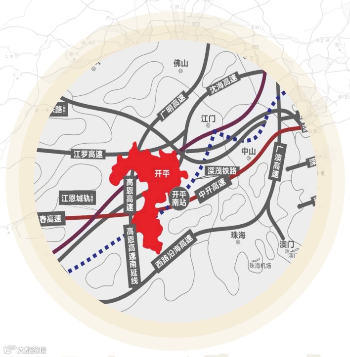 开平是广东省首个县级国家园林城市、全国著名的侨乡,地处五邑侨乡的区位中心,与新会、鹤山、台山、恩平、新兴相连,同时位于珠三角1.5小时生活经济圈内,距离G5沈海高速入口仅约7公里,辐射面扩展至到临市恩平、台山、新会等地。