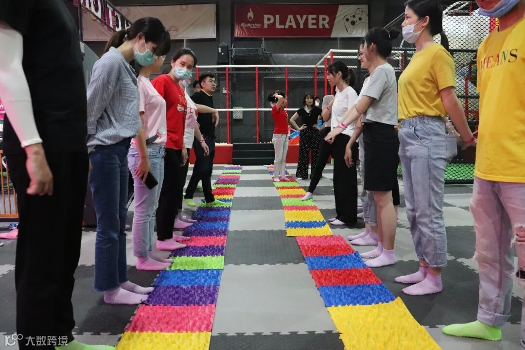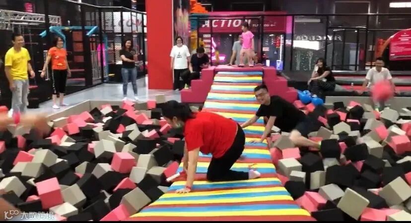 这项目要求每队8人一组在海绵赛道上来回完成接力跑, 每队人员全部跑完才算获胜。