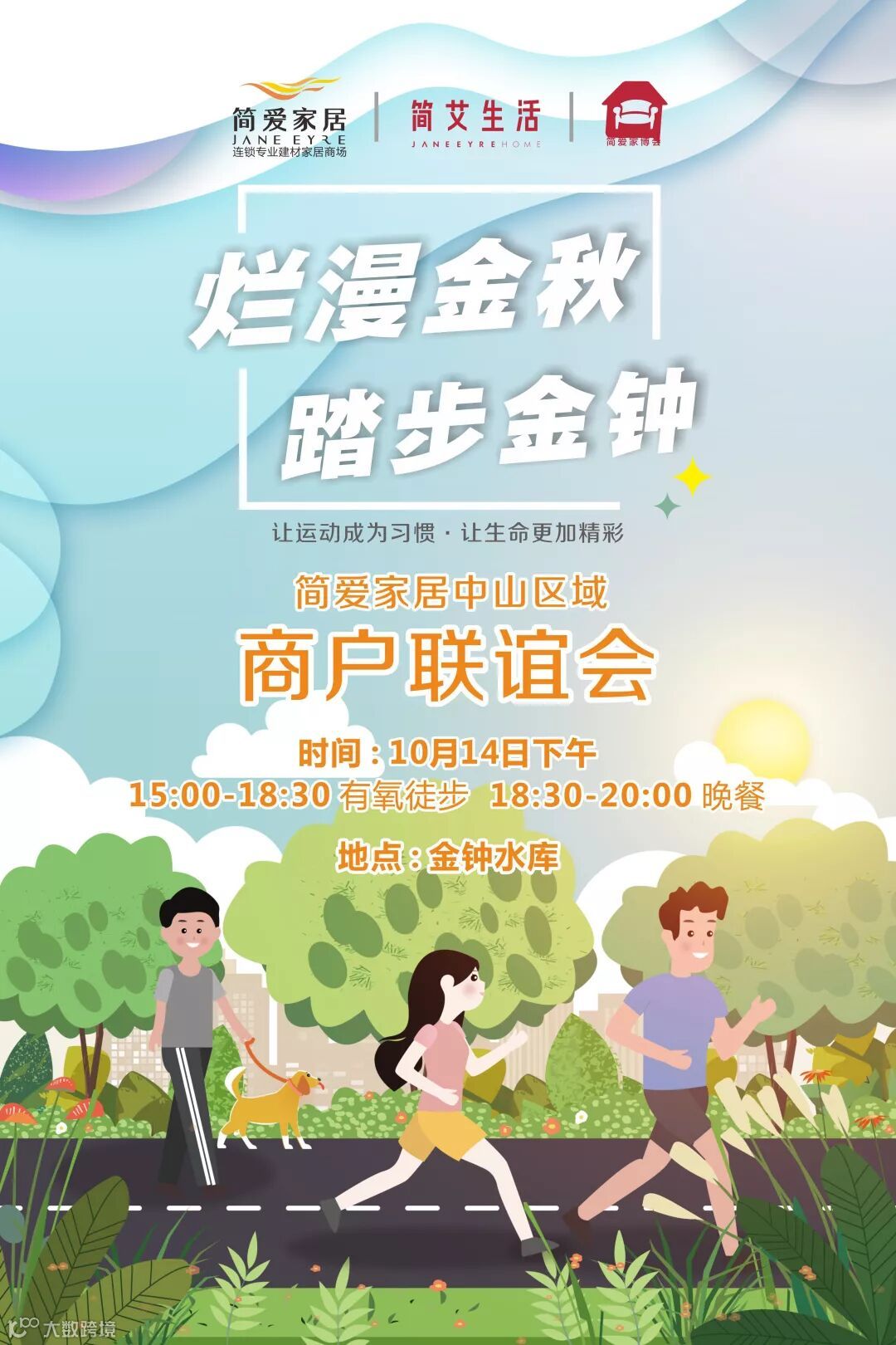 2019年10月14日,简爱家居一大区域商户联谊会在金钟水库进行,组织中山区域商户伙伴徒步美丽的金钟水库。让运动成为习惯,让生活更加精彩。