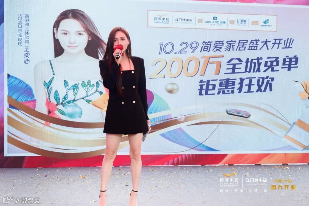 2020年10月29日歌手明星王奕心盛装出席江门纬丰店开业典礼现场,献唱歌曲、粉丝互动为简爱家居江门纬丰店打call,为雅兰品牌打call。明星王奕心现场送出开业钜惠大礼包,带动现场气氛,为消费者传递精致生活方式,让精致艺术生活家走进千家万户。