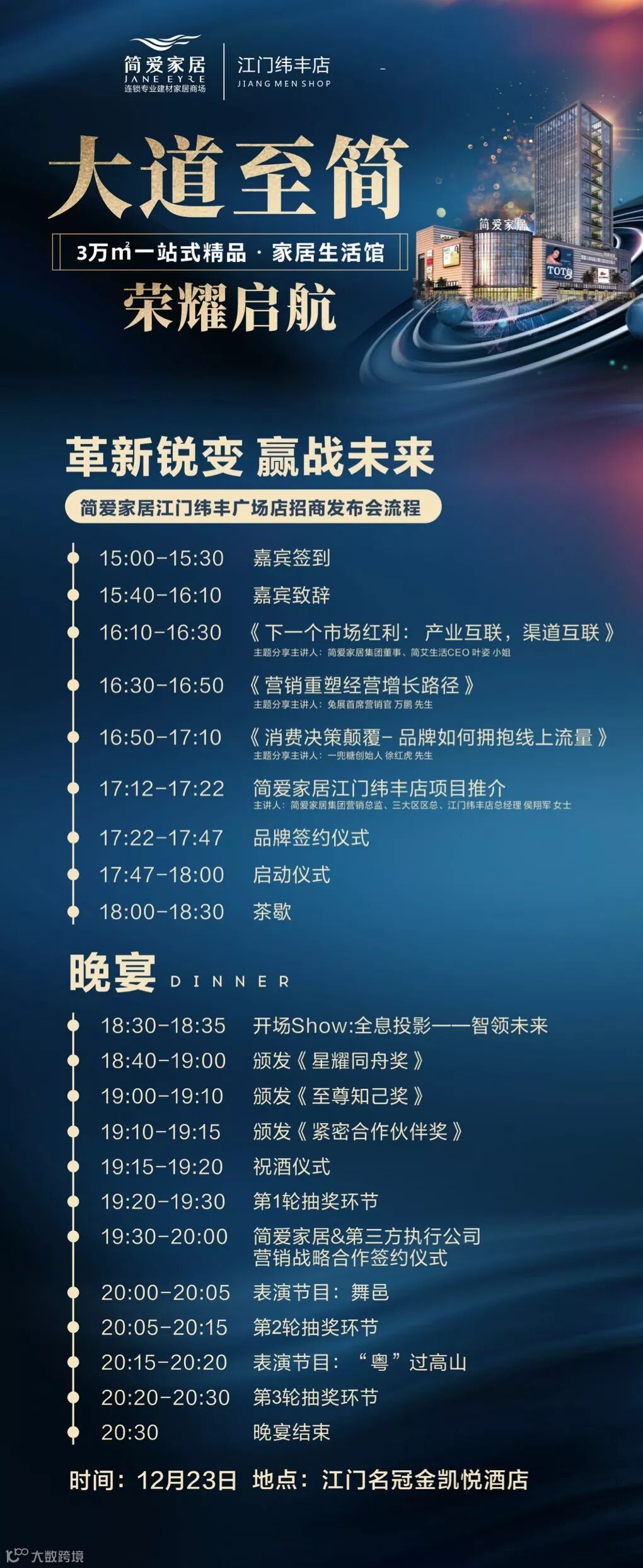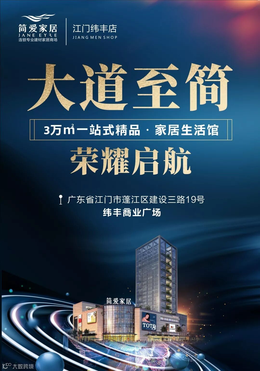 12月23日,2020年来临前第一站落地江门,也将迎来简爱家居江门纬丰广场店招商发布会,将全国家居行业领军人士共同见证——家居·艺术生活馆华丽绽放,共同探讨:大数据经济时代,在流量爆发的红海市场里取胜法则,线上线下全城营销之道,旨在建材家居行业突围时代之困,打造第一代增长曲线。