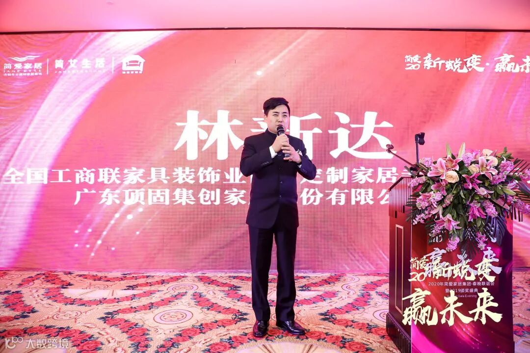 晚宴现场有广东省家具商会会长/斯帝罗兰董事长 周子鹏;中山市大信新都汇商业投资有限公司 潘帆 副总经理;全国工商联家具装饰业商会定制家居专委会执行会长/广东顶固集创家居股份有限公司董事长 林新达莅临简爱家居集团春晚联谊会暨颁奖盛典并上台致辞。以及有全国工商联家具装饰业商会常务副秘书长/京派家居品牌联盟秘书长殷超;全国工商联家具装饰业商会 门业专委会秘书长/青委会秘书长郑珊珊;广东省家居业联合会执行主席蒋德辉;中山家居商会秘书长谢绮云等重要嘉宾出席。