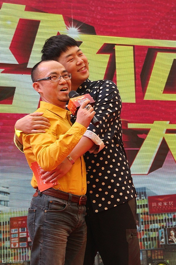顾家家居副总裁刘宏专程从杭州赶来中山参加庆典,对简爱家居的创举甚为感动。图为他与明星杜海涛热情拥抱