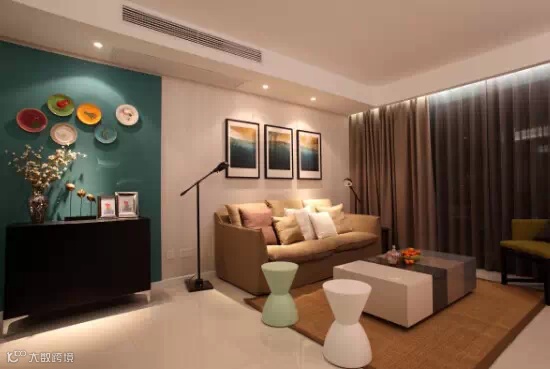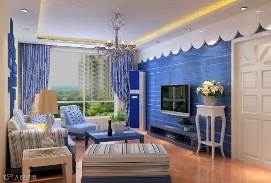 客厅顶面采用双层异形吊顶,45度斜角线石膏板搂槽效果,使顶面更具层次感。电视墙采用木板擦色做旧处理,海蓝色漆面,使整个客厅海面般色彩的冲击力。