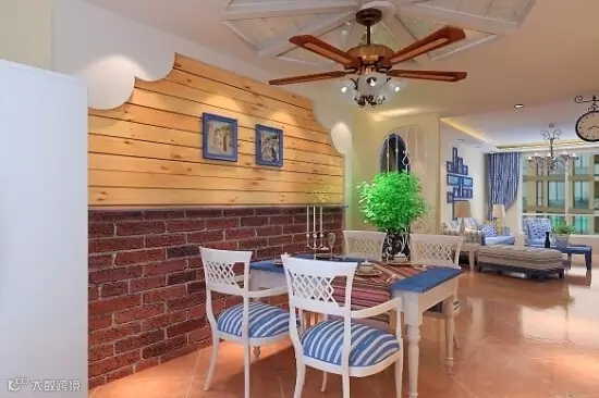 同样是蓝与白两种色调的组合,分别将木头、砖、石、涂料、布艺等不同材质进行搭配,会大大减低空间的额的单调感,让细节变得丰富,适当小面积地加入木色等其他色彩,不仅不会破坏浪漫清新的整体氛围,还可以使空间更自然和富有亲和力。