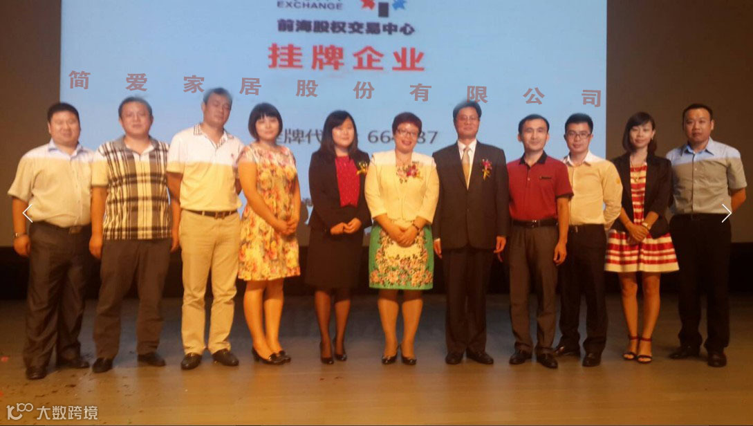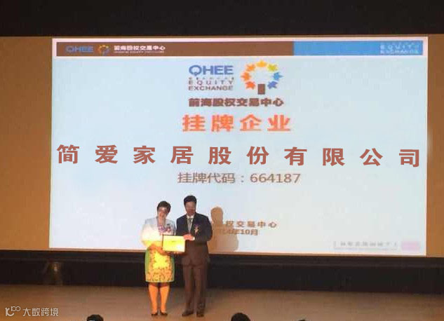 前海股权交易中心陈俊生副总裁为简爱家居股份有限公司罗辑俐董事长授牌