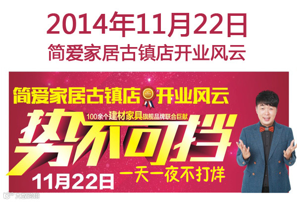 11月22日,【简爱家居·古镇店】将盛大开业。届时,香港著名演员“laughing哥”谢天华将亲临现场,倾情献唱,与拉丁舞蹈大赛冠军激情共舞,内地著名目主持人杜海涛也将亲临现场与粉丝零距离互动小游戏,并赠送亲笔签名照片及礼物。开业当晚,一场青春激情的摇滚音乐盛典将会在音乐喷泉的背景下火爆开唱!
