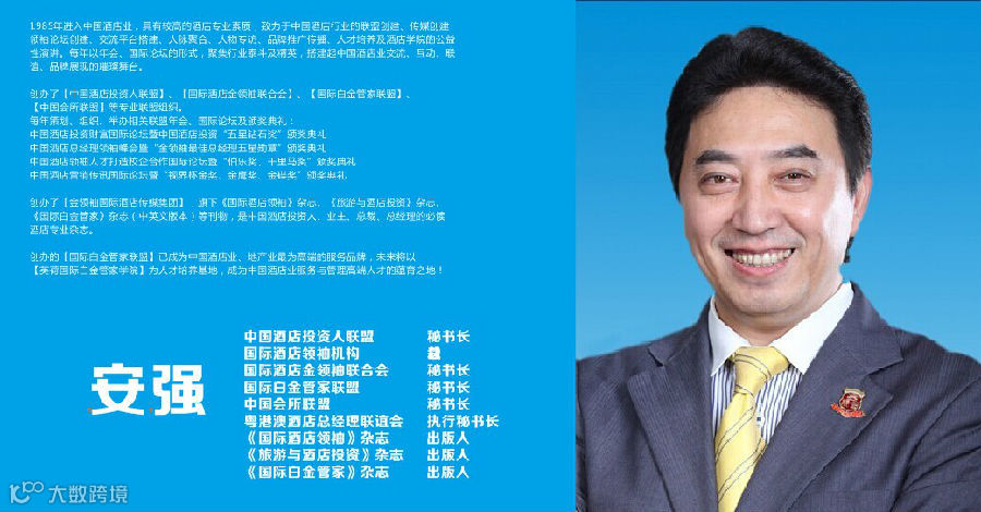1985年进入中国酒店业,具有较高的酒店专业素质;致力于中国酒店行业的联盟创建、传媒创建领袖论坛创建、交流平台搭建、人脉聚合、人物专访、品牌推广传播、人才培养及酒店学院的公益性演讲。每年以年会、国际论坛的形式,聚集行业泰斗及精英,搭建起中国酒店业交流、互动、联谊、品牌展现的璀璨舞台。